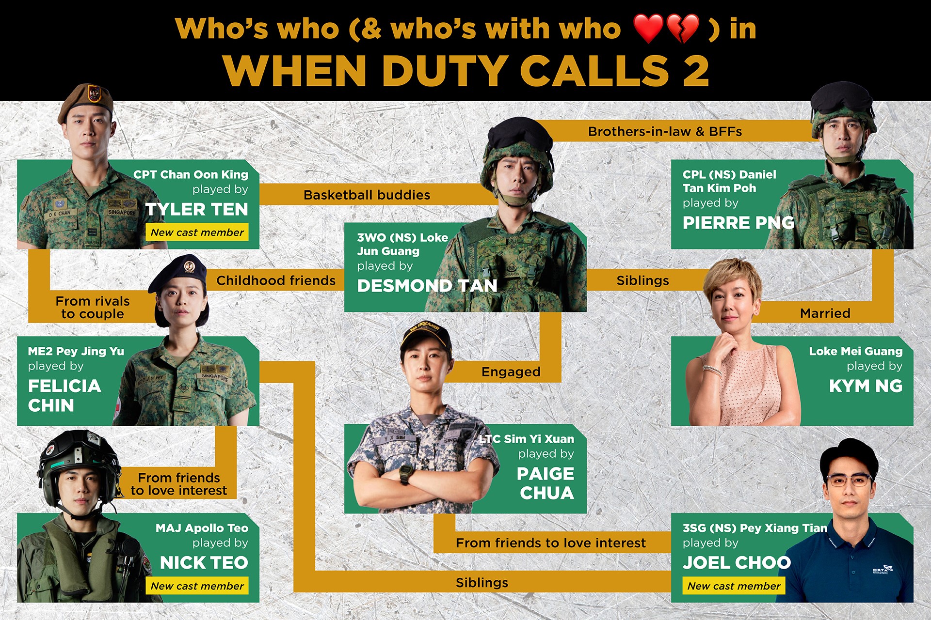They are joined by new faces Tyler Ten, who plays a Regular from the Army Deployment Force, Nick Teo, who plays a Super Puma pilot and Joel Choo, who plays an engineer from the Defence Science and Technology Agency.