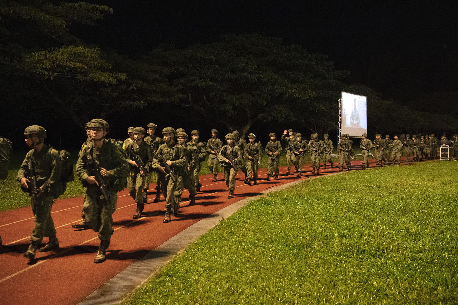 Recruits are almost halfway through their march as they reach their 8km rest point, in a dark open field deep into the north-western tip of Tekong.