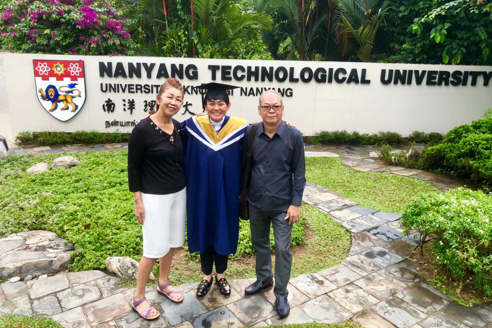 MWO Yuen (tengah) bersama ibu bapanya semasa konvokesyen NTU pada tahun 2019.