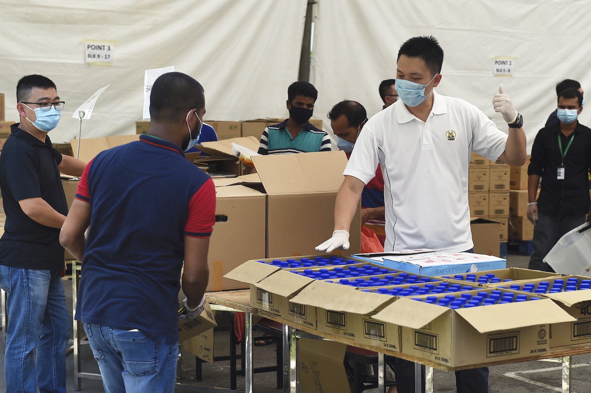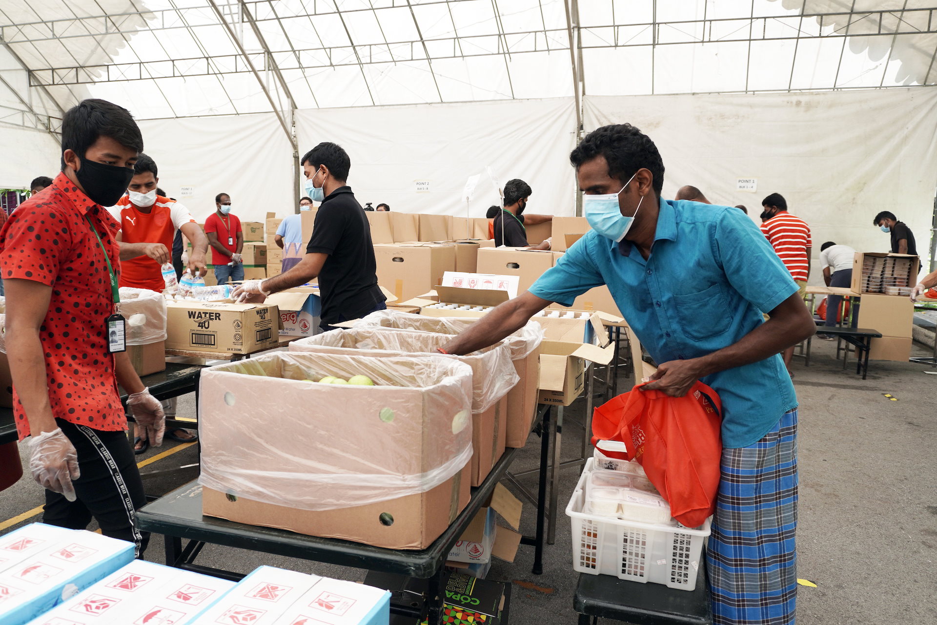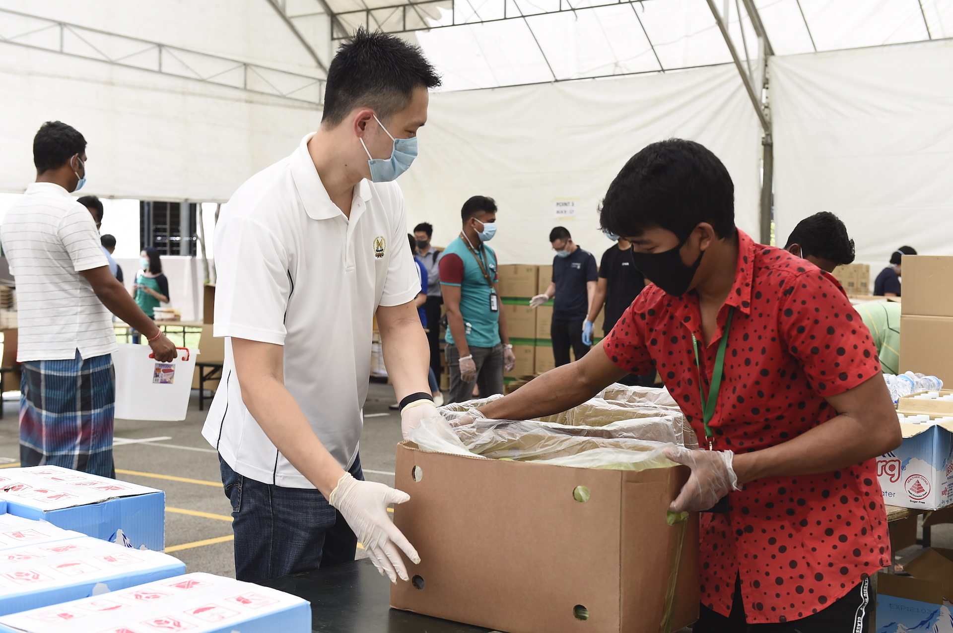 One of the first things they did was to set up a 20m by 30m tentage at the dormitory's open-air courtyard, for distribution of food daily. As part of gazetting operations, residents must stay in their rooms at all times except for the collection of meals. Only one person per room is allowed to collect meals for the room.