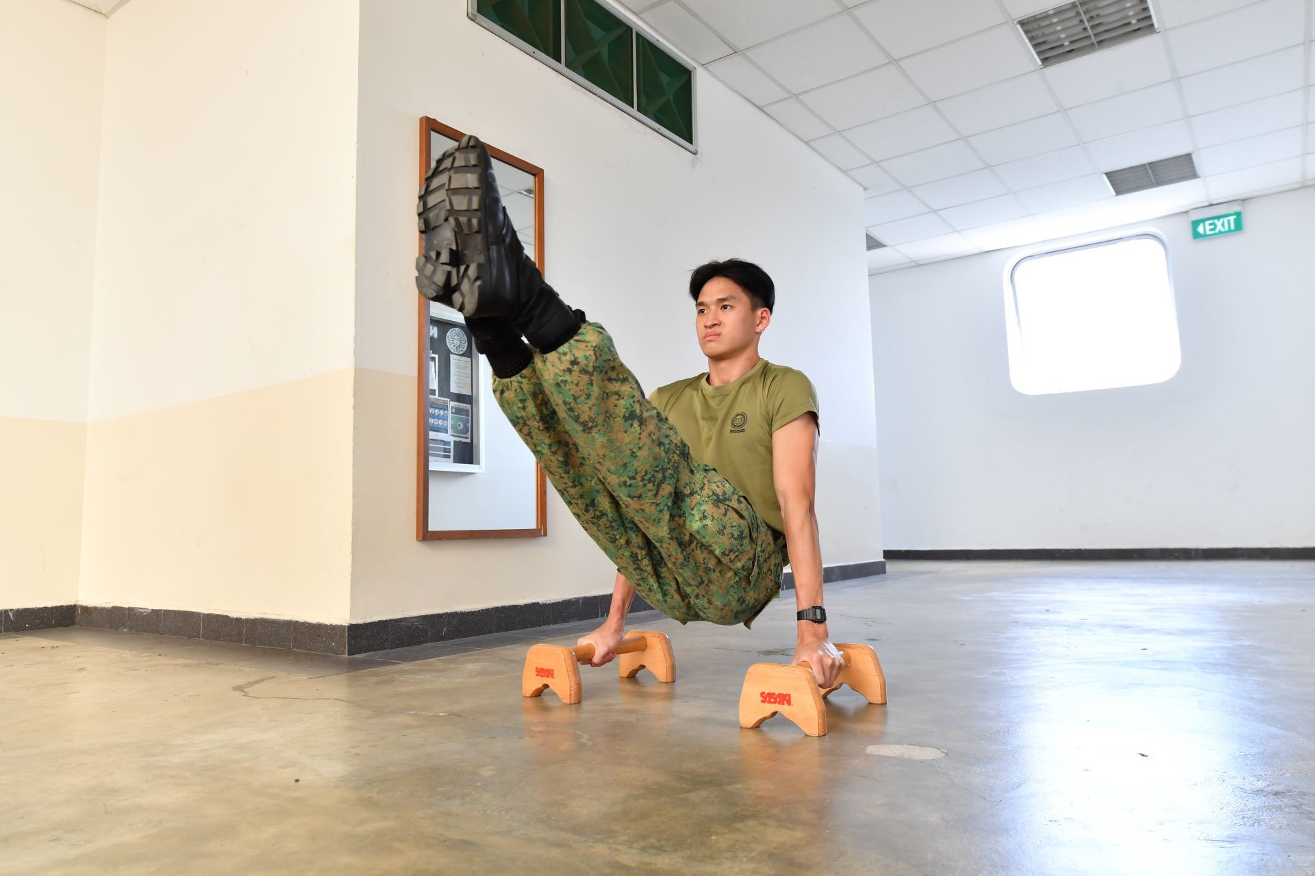 When they were on duty, CPL Lim and his team often had to be in their bunks in case of an activation. He would then use the time to keep up with his strength training and even brought his own weights and a pair of parallettes (gymnastics equipment that simulate parallel bars) into camp to do so.
