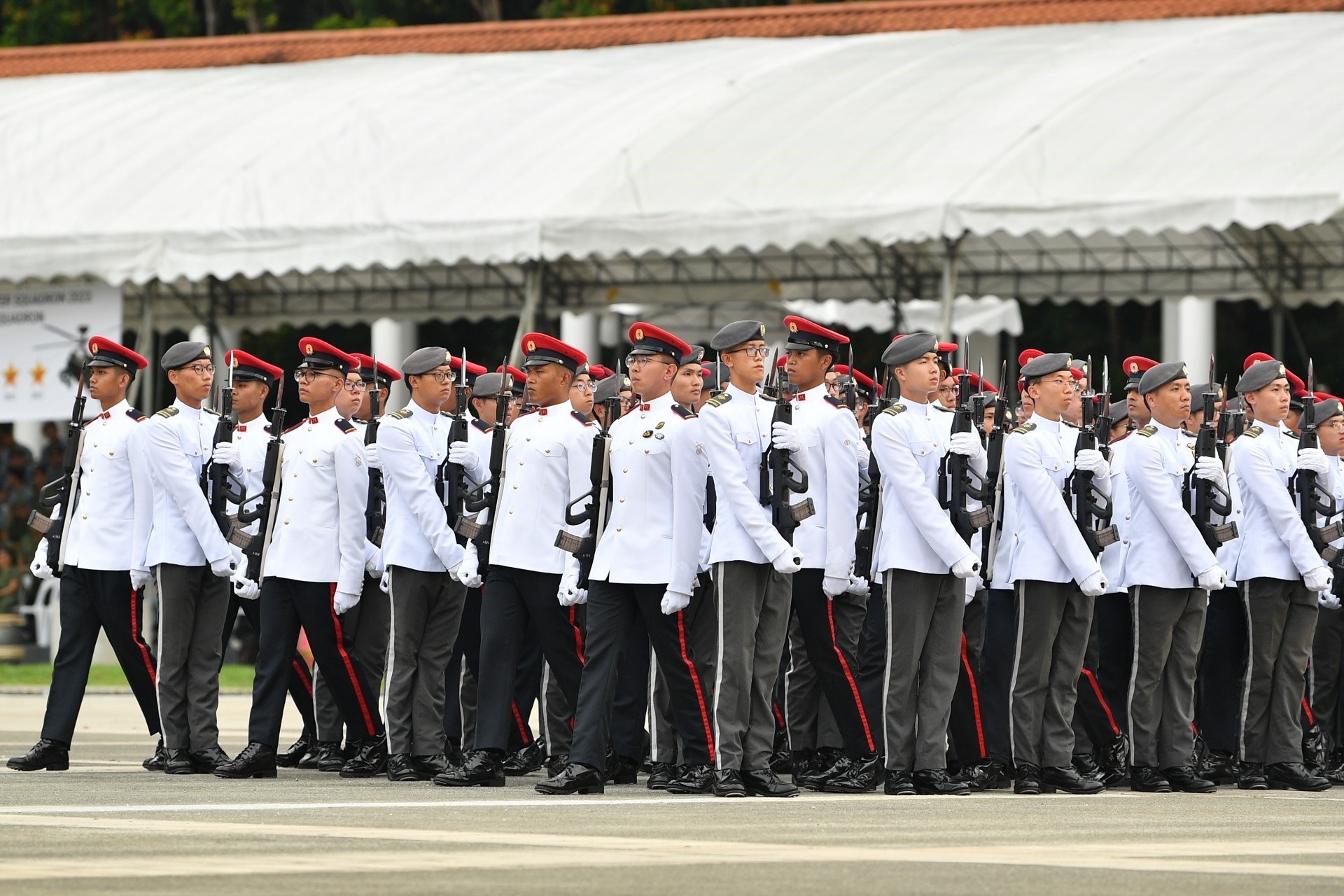The MP Command GOH contingent marching through the DIS GOH contingent during the Trooping of Colours. As part of the ceremony, the Colours escort marches through the GOH contingents, passing in between the rows of soldiers.