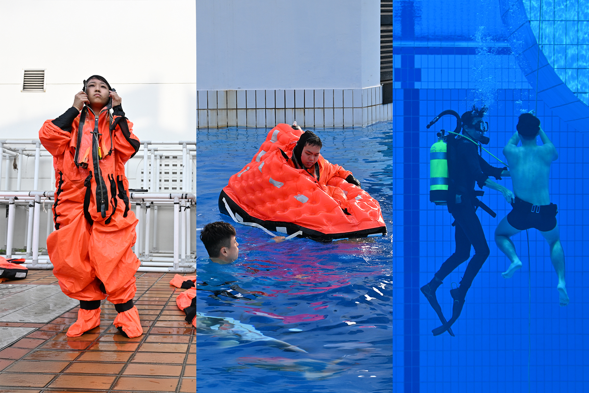Under the supervision of instructors from the Naval Diving Unit (NDU), they dive to 6m underwater and slowly ascend to the surface without the use of the diving regulator.