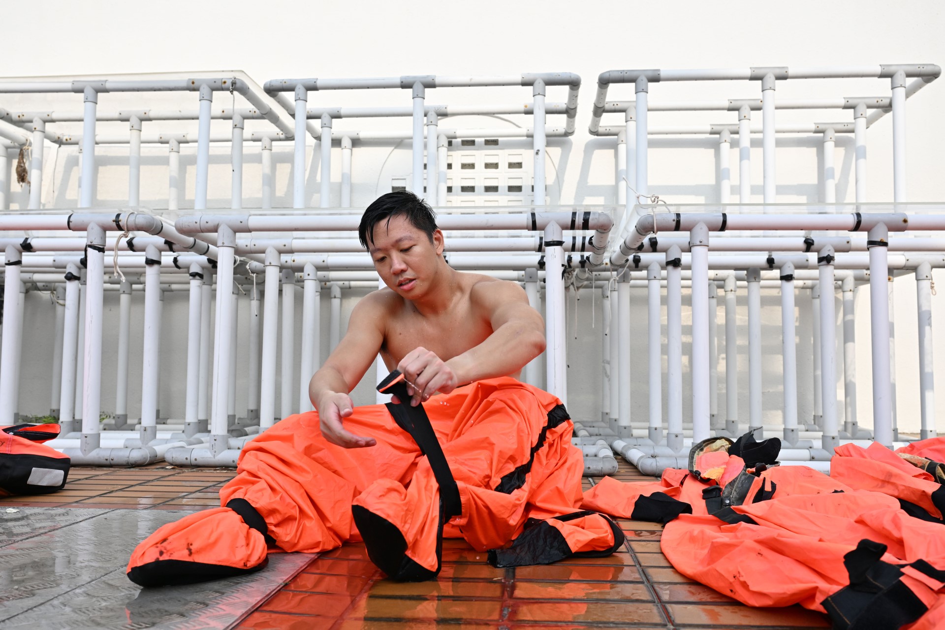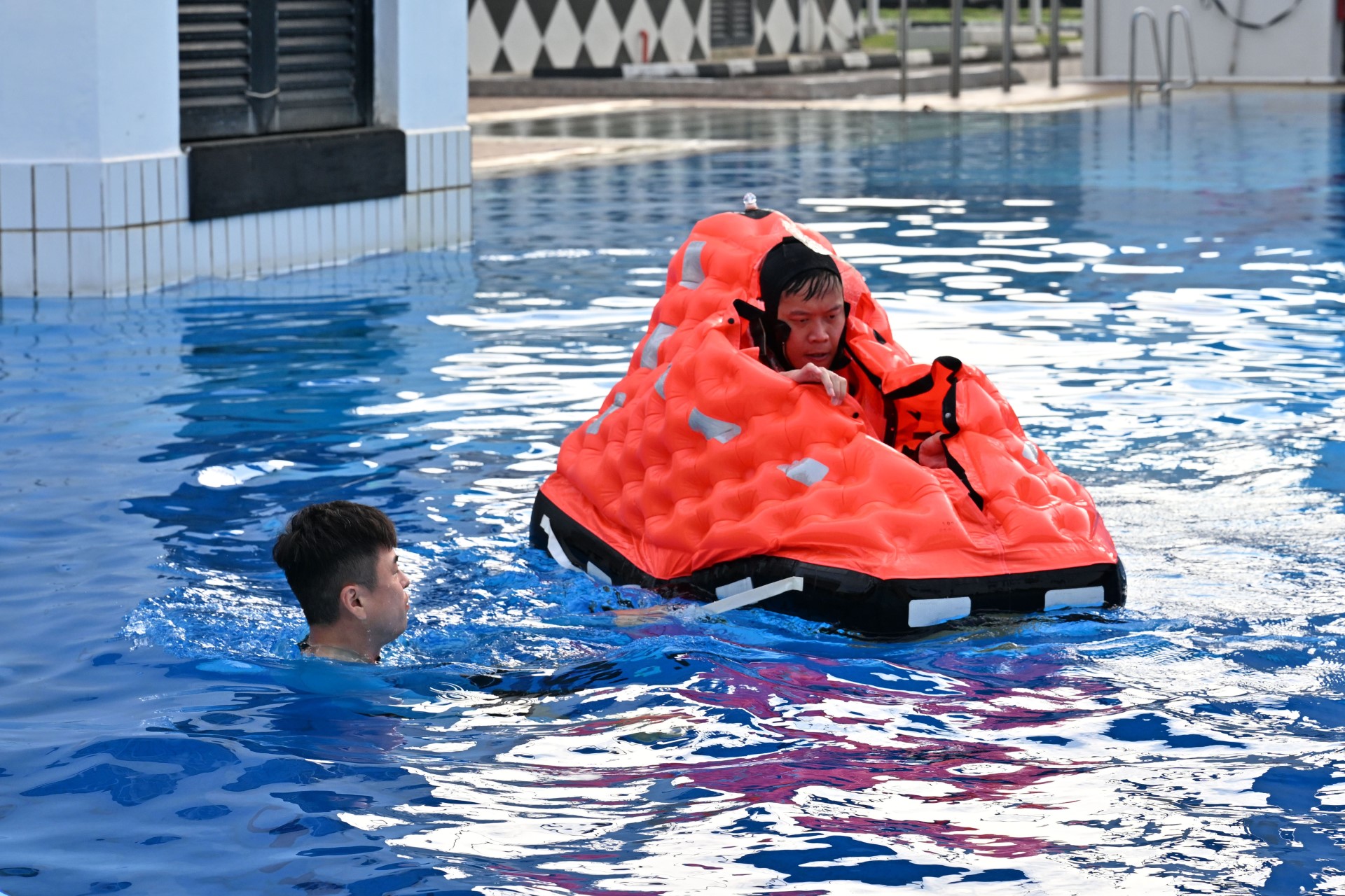 Trainees then deploy the single-man life raft, which can last for more than 24 hours out at sea as they await rescue.