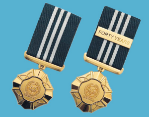 35-year medal recipients will receive the gold, diamond-shaped medal while 40-year recipients will receive a clasp to be affixed on the medal's turquoise ribbon.