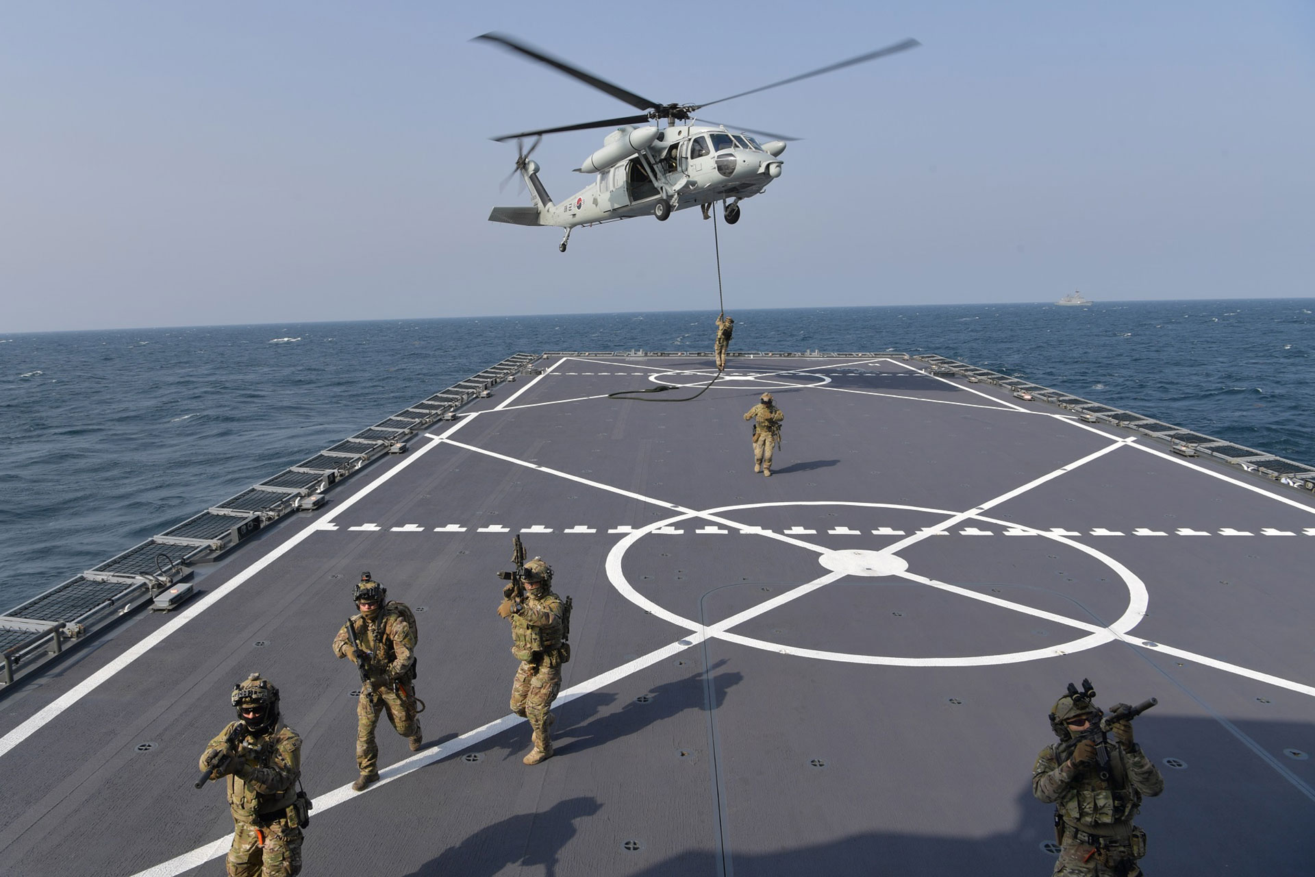 The sea phase of the MS FTX began in the waters off Busan, ROK. In one exercise scenario, a ship was suspected to be transporting armed personnel and dangerous weapons.