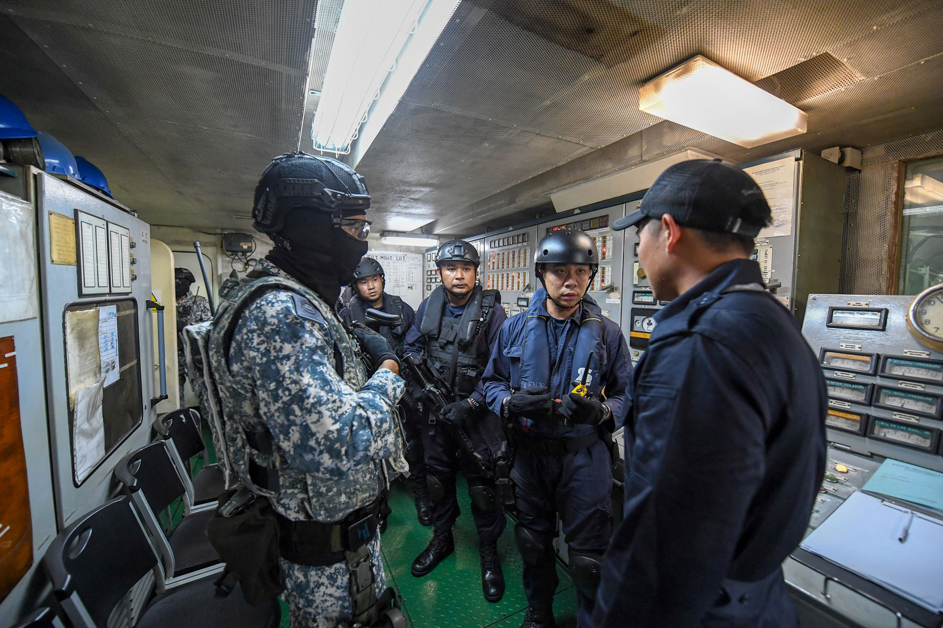 Acting on information received through the earlier info-sharing exercises, boarding teams from the Singapore, Brunei, India and ROK navies conducted a search on a simulated hijacked ship.