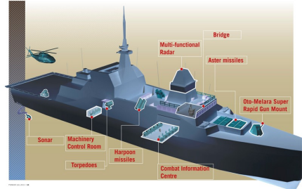 Active Low Frequency Towed Sonar system enables detection of enemy submarines at an extended range. The frigate's anti-surface and anti-submarine capabilities are augmented by the Sikorsky S-70B naval helicopters which pack a comprehensive radar-sonar suite and Whitehead torpedoes.