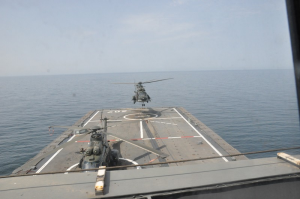 An RSAF Super Puma taking off from the deck of Landing Ship Tank RSS Endurance while in the Gulf of Aden as part of multinational anti-piracy efforts there.
