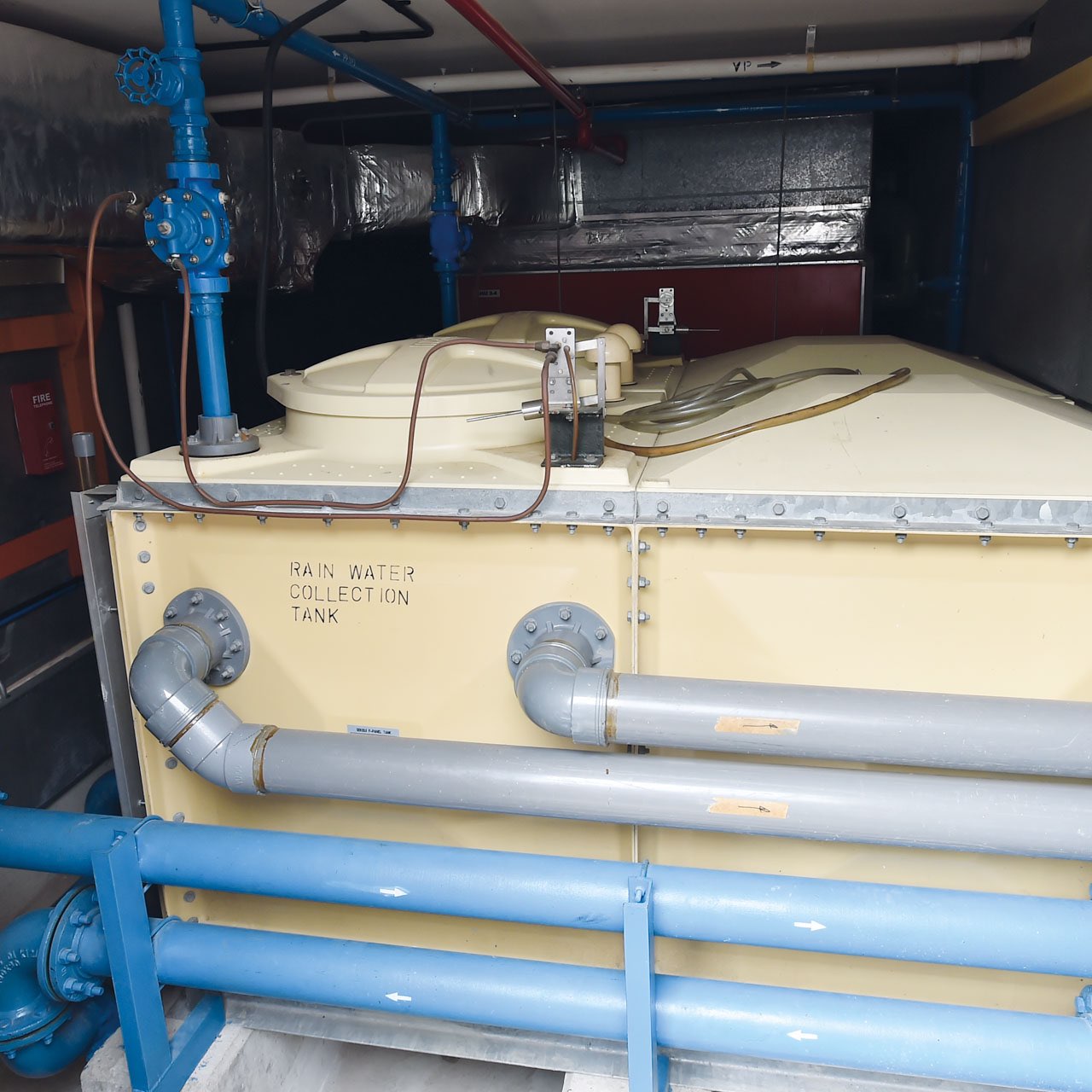 Rainwater from the roof is collected into tanks (pictured right) and used for flushing. There are currently 17 rainwater collection tanks across the naval base with a total holding capacity of 57,000 litres. With an average rainwater collection of 10 million litres (equivalent to four Olympic-size swimming pools) a year, this translates into yearly water cost savings of up to $32,000.