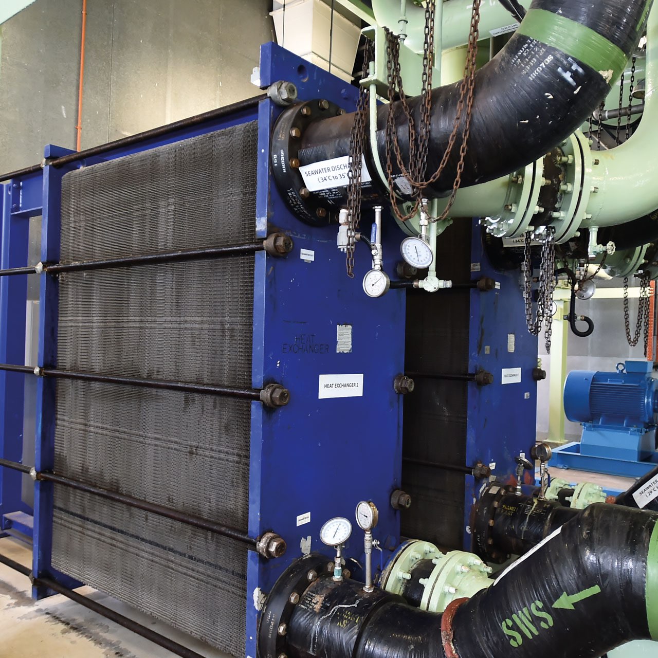The heated seawater then flows back to the sea, while a fresh cold batch is pumped in to repeat the heat-removal process (black pipes in middle photo).