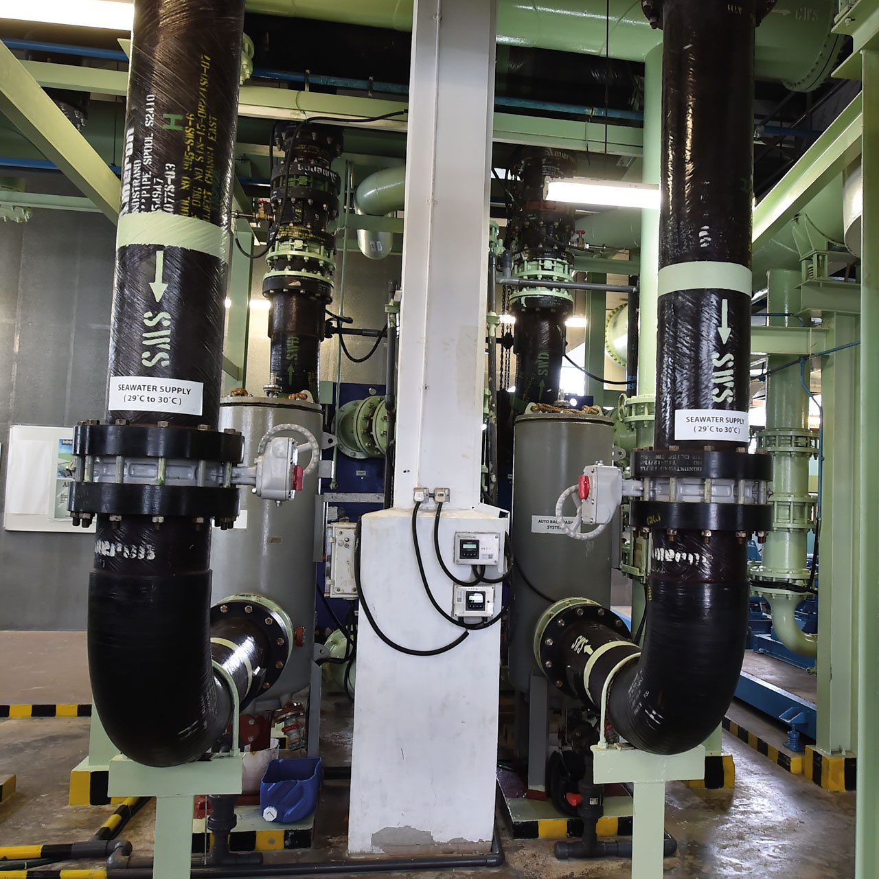 Using seawater will result in the growth of barnacles and marine organisms, which choke the system and cause corrosion. To prevent this, corrosion-resistant materials like fibre-reinforced plastic pipping were selected and chemical treatments such as chlorine were added in the pumps to inhibit marine growth. A passive filter was also fitted at the wharf to remove large marine particles.