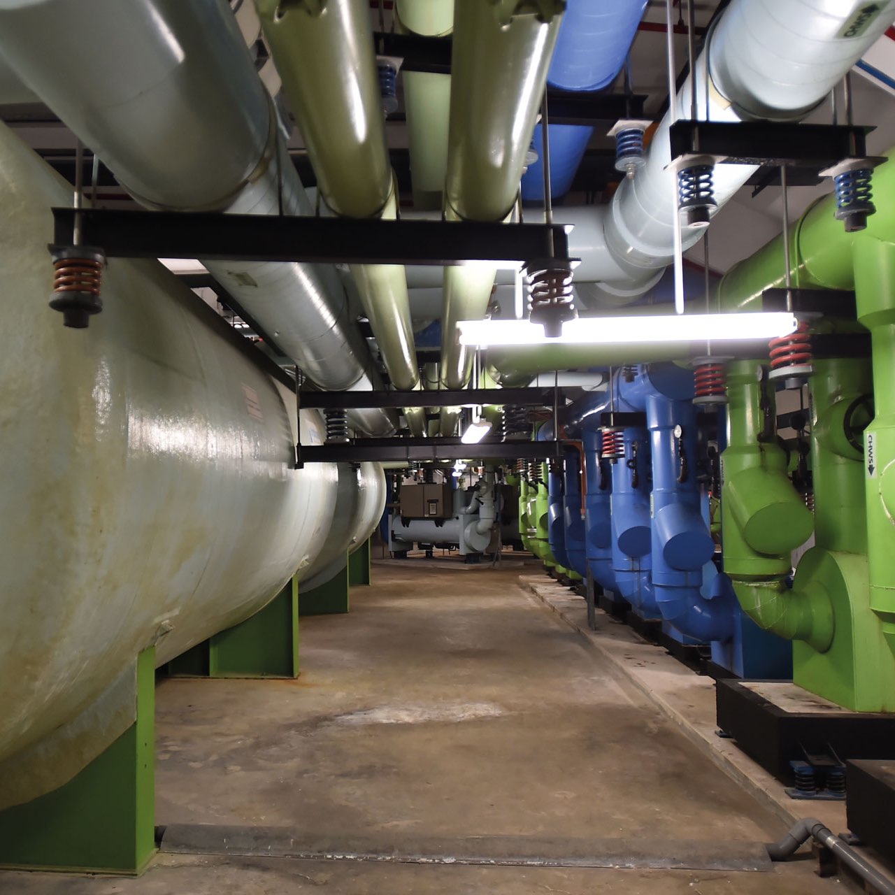 At the same time, chilled water in the pipes is also pumped to the air-con units in the buildings to cool the air.