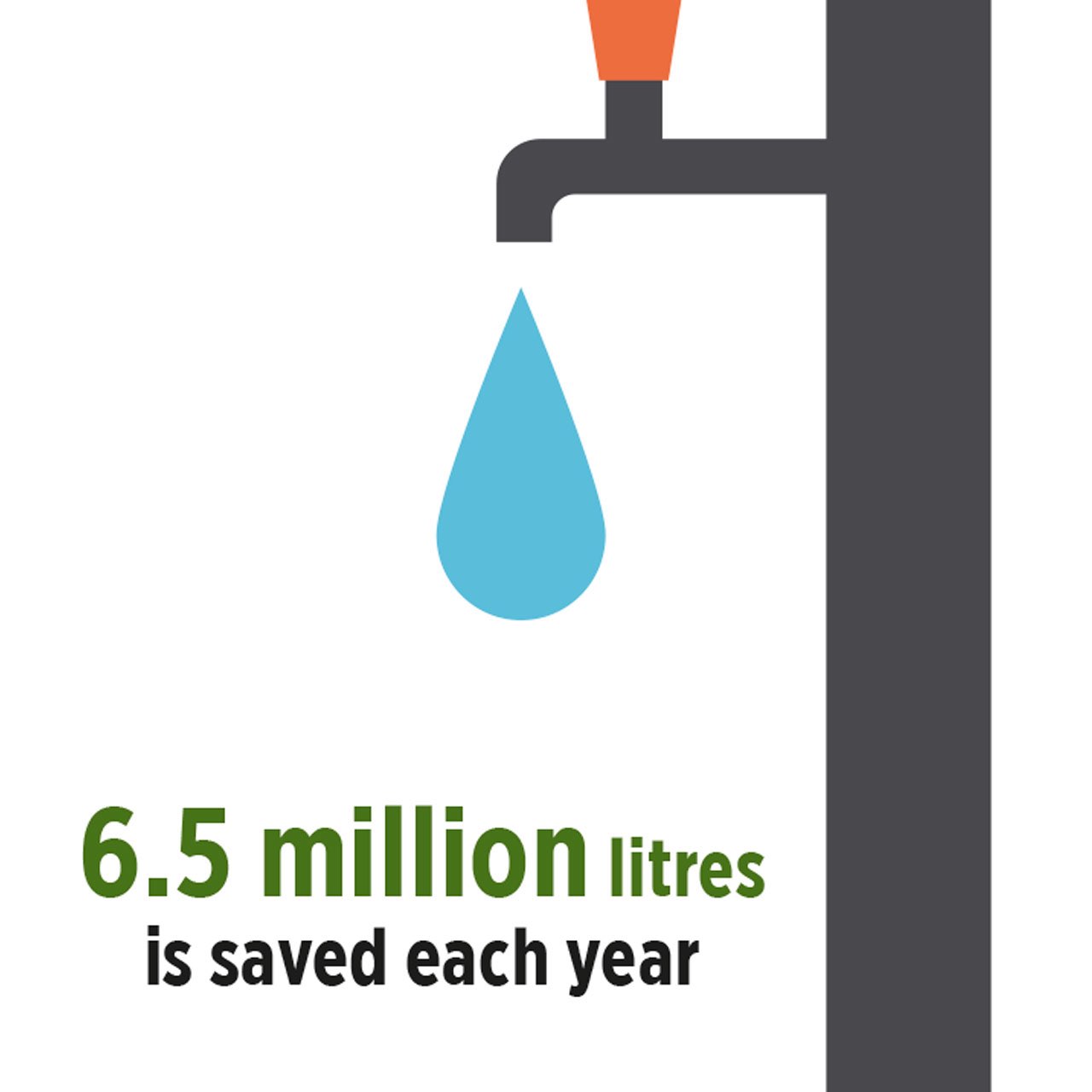 Water-efficient taps and flushing systems reduce the consumption of water by about 6.5 million litres each year, which is the volume of about two-and-a-half Olympic swimming pools.