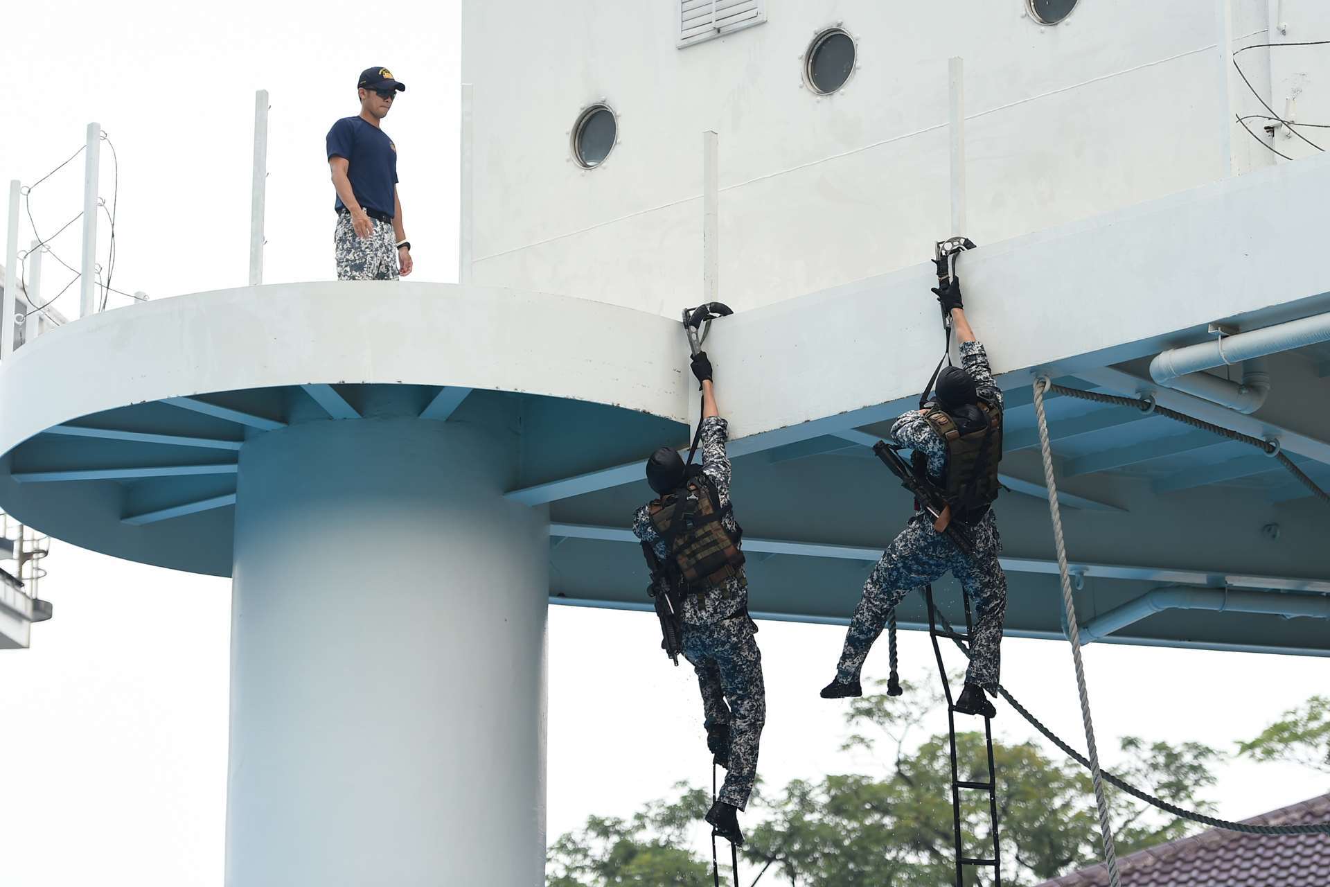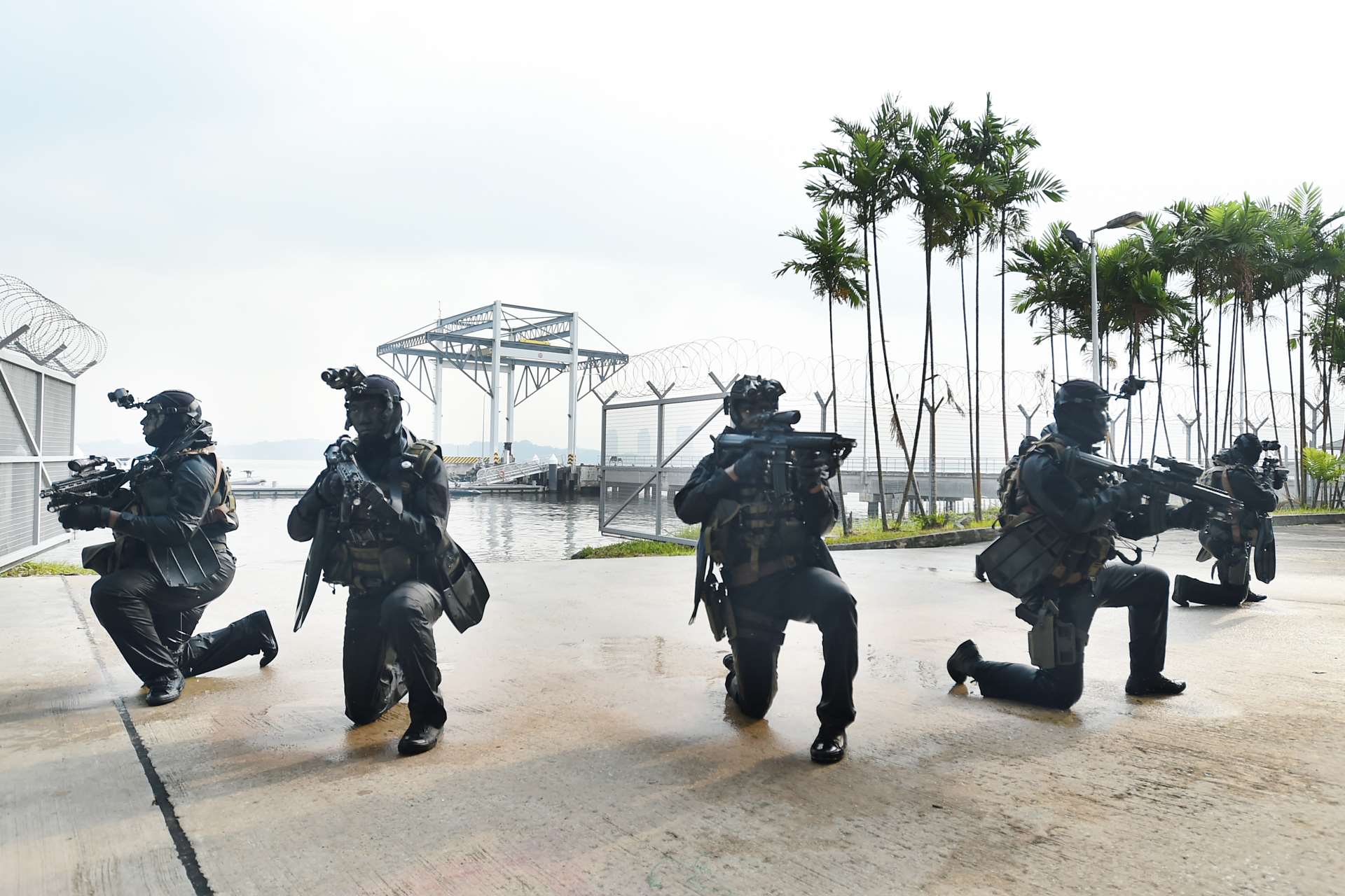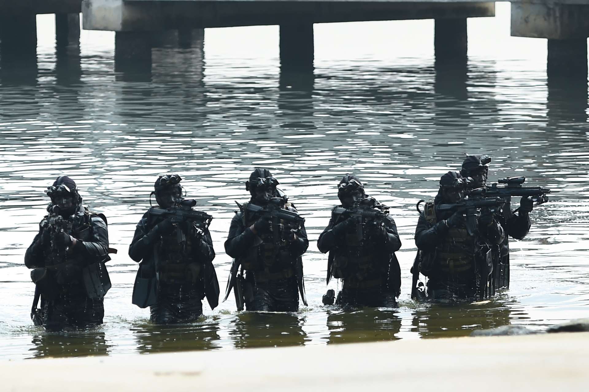 To emerge covertly from the sea and attack forces on land requires strong teamwork and coordination, especially under strong tidal conditions. The divers are armed with 22kg of gear and weapons including a load-bearing vest, night vision goggles and the HK416 assault rifle — which increases by a third of its weight when wet.