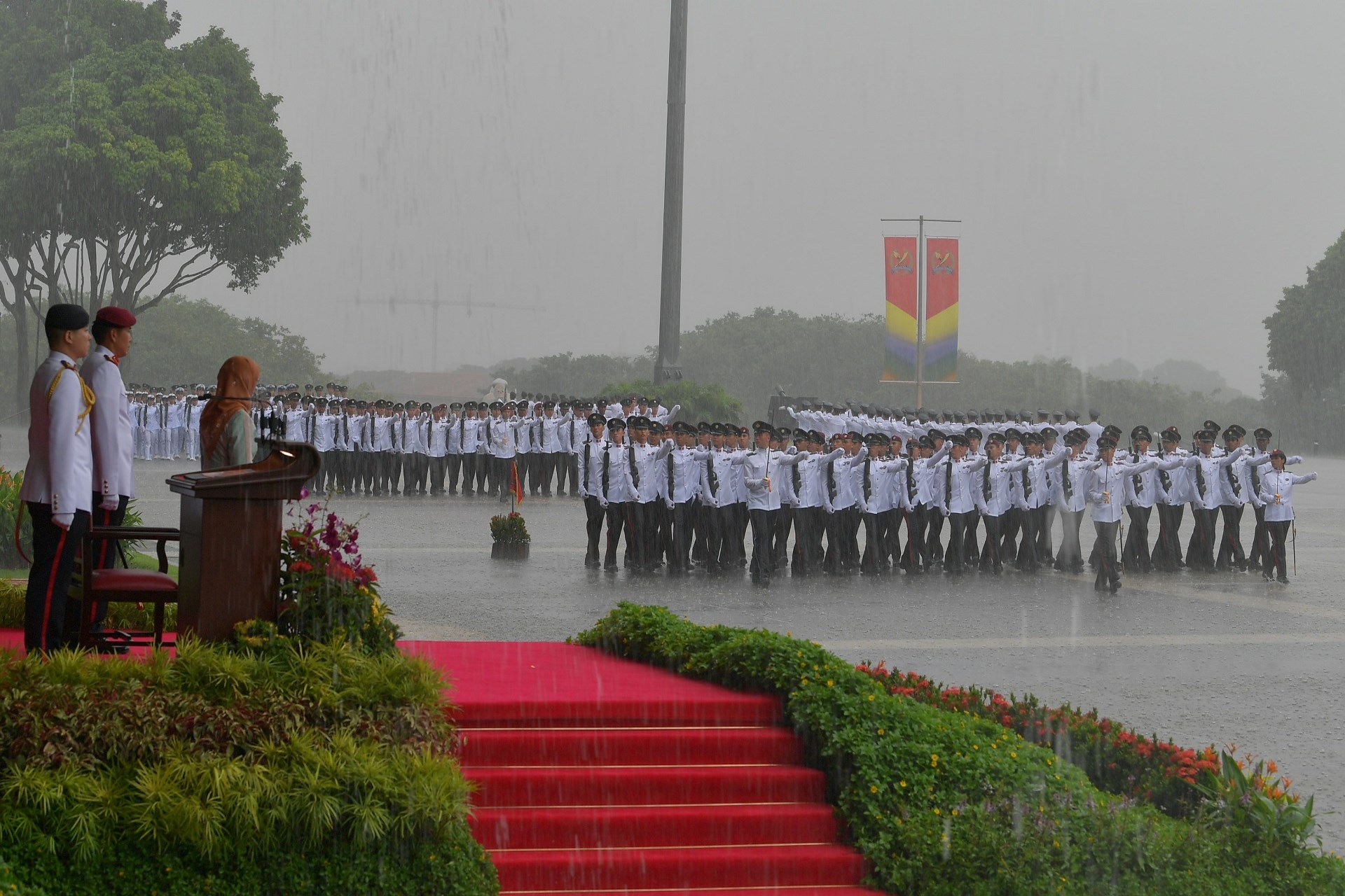 Despite the heavy downpour, the soldiers stood at attention and marched valiantly, drawing applause and cheers from their families and friends in the grandstands.
