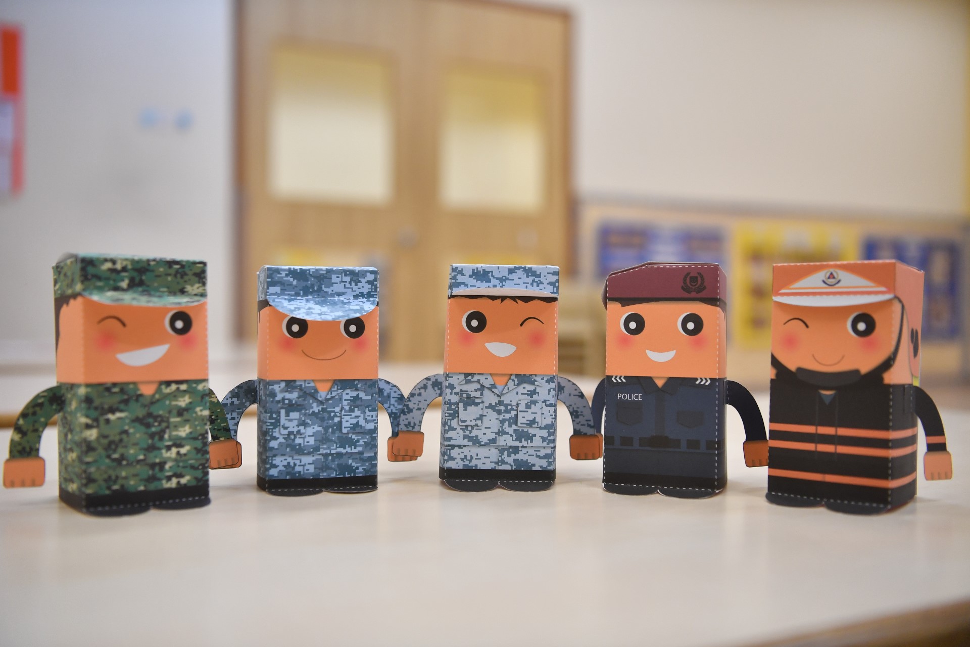 The paper figurines depict servicemen across the Army, Navy and Air Force in the Singapore Armed Forces, as well as the Singapore Police Force and Singapore Civil Defence Force. The children can also write their own appreciation messages at the back of the figurines.