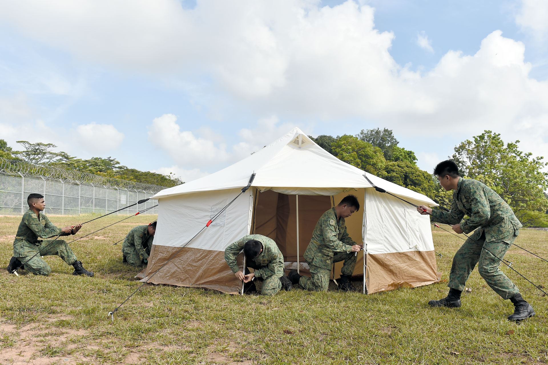 Training at Nee Soon Camp, a team from Spear Company practises the setting up of a tent that can house five people.