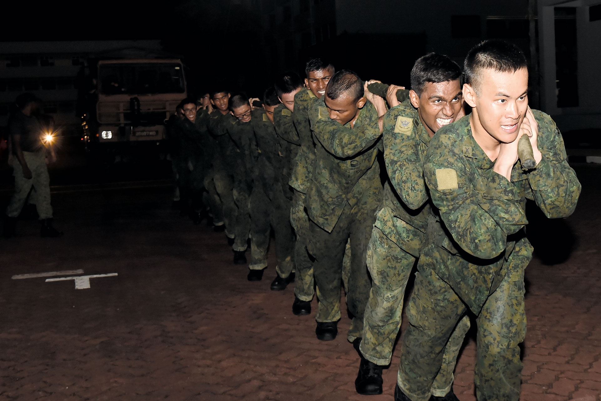 Next in their test of endurance, they clutch a long rope and gather all their strength to pull a 5-tonner truck over a 100m distance.