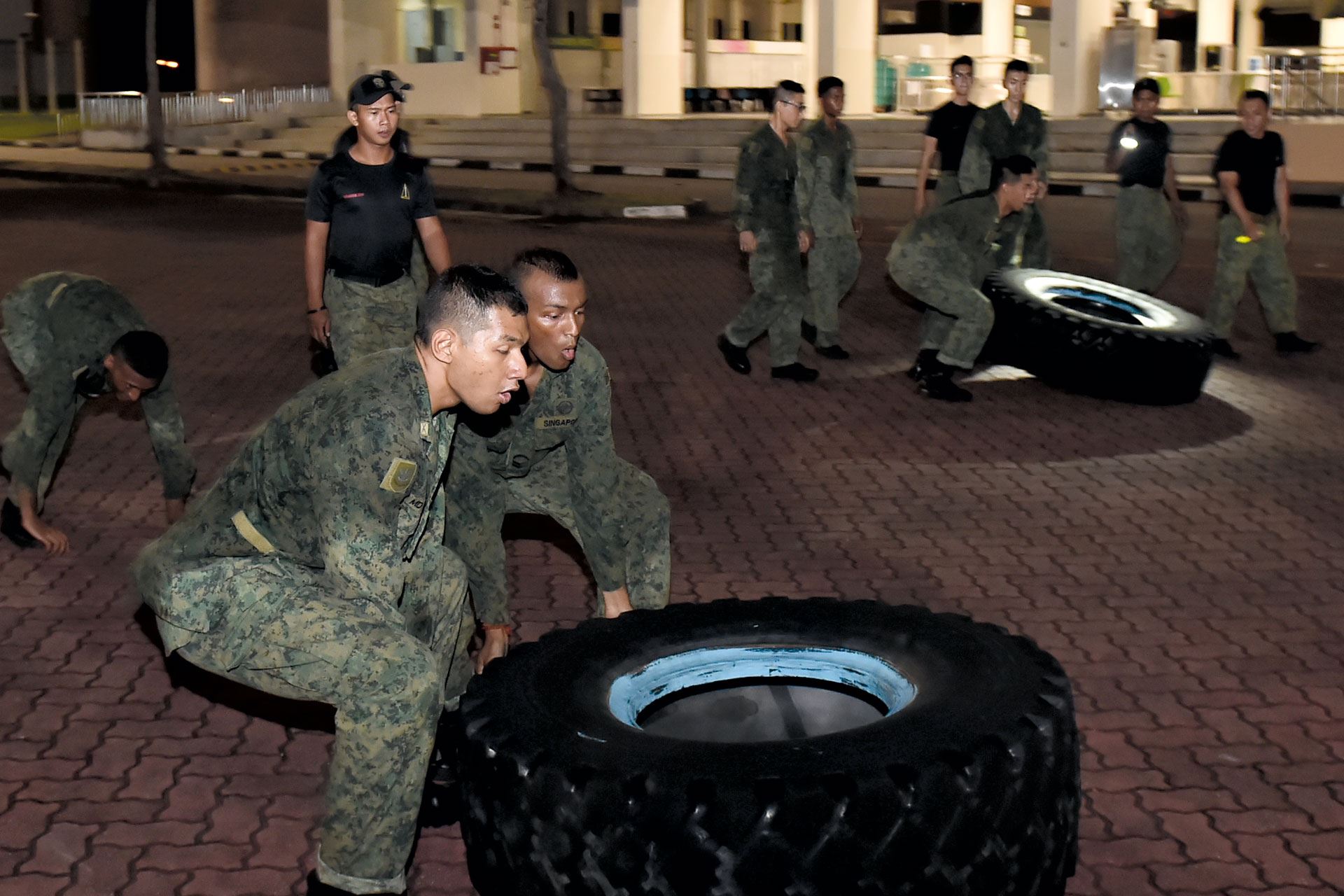 A tyre race follows. Trainees work in teams to flip a 100kg tyre across the parade square.