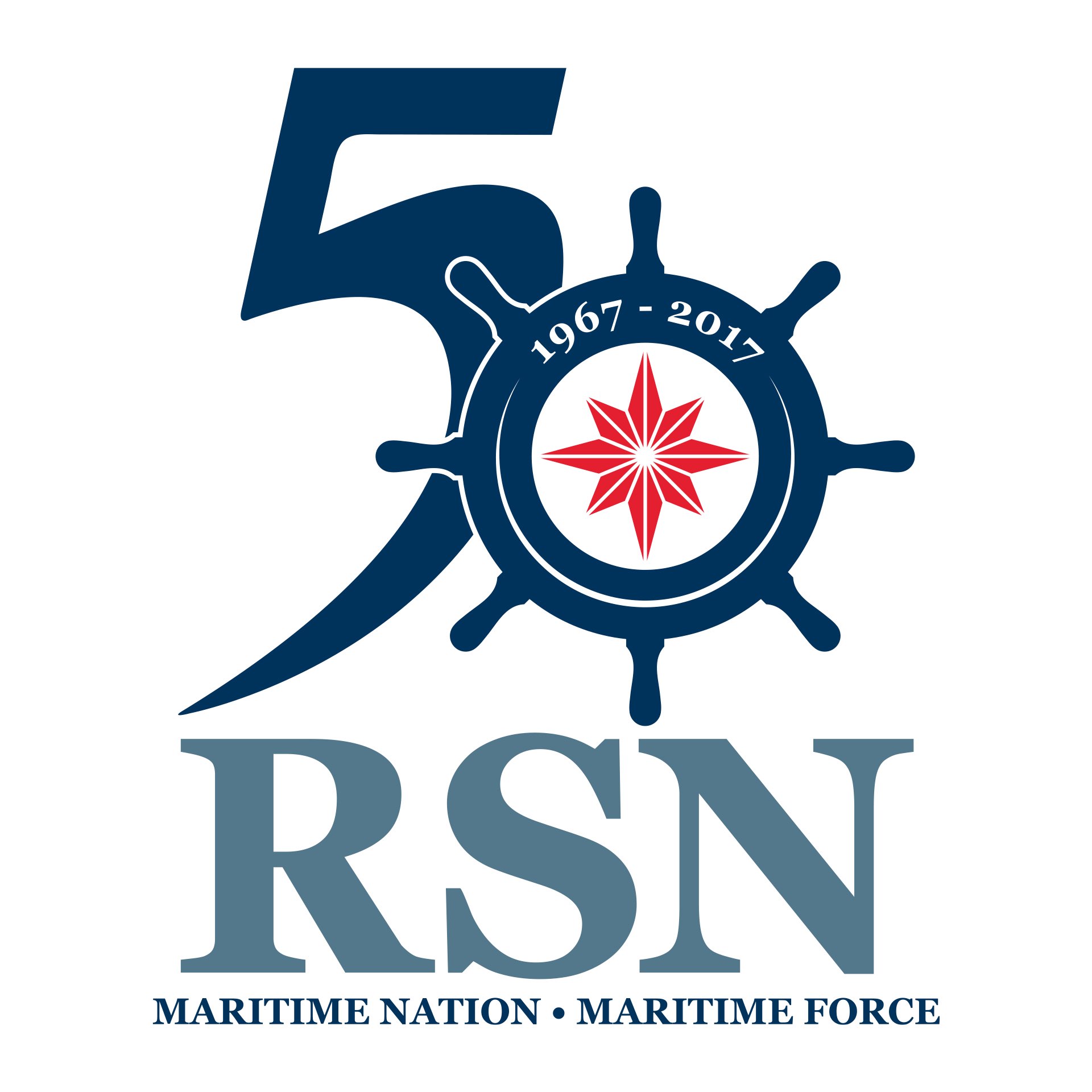 The "5" is shaped as a ship's bow and signifies how the RSN has taken great strides to attain the world-class standard it possesses today. The "0", which is shaped like a ship's wheel, symbolises the contributions of the earlier generations of sailors. The mariner's compass represents the values that the RSN holds dear since its early years as it continues to establish its presence on the international stage. The tagline "Maritime Nation, Maritime Force" emphasises the important role that the Navy plays to keep Singapore's coastline safe.
