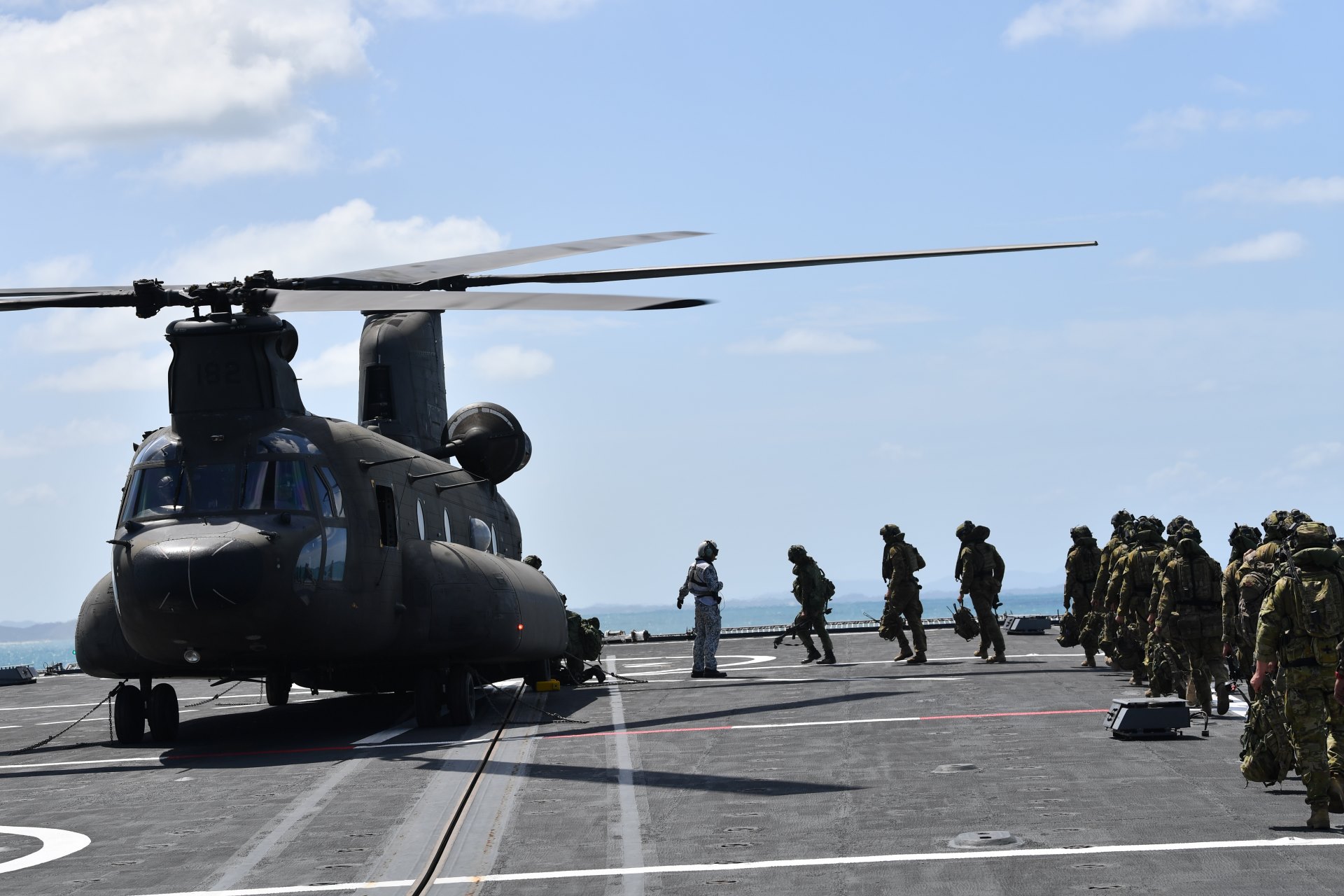 As part of their visit, Mr Heng and Mr Fawcett witnessed an advance party of SAF and ADF troops embarking the CH-47 Chinook helicopter on the ship's flight deck.