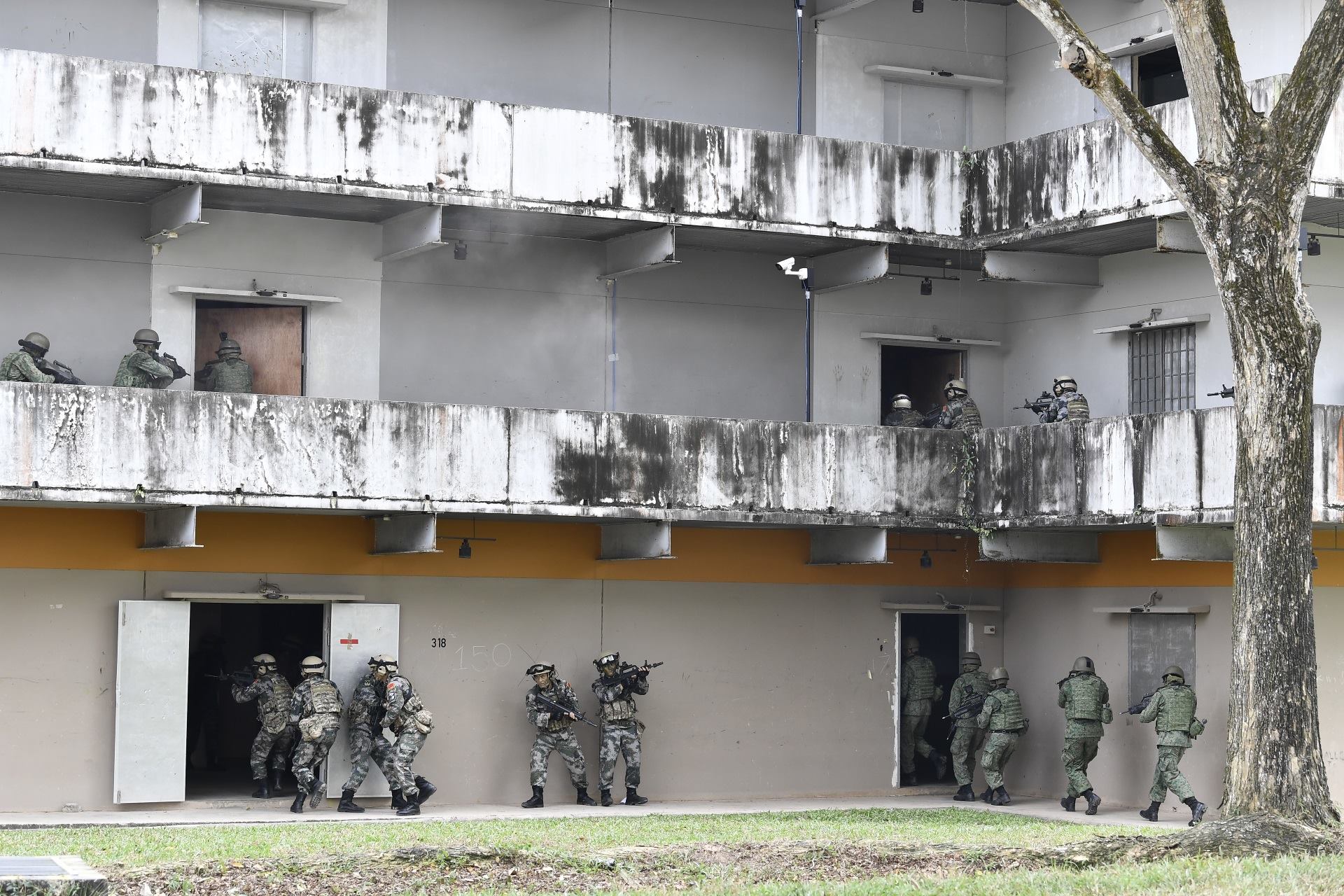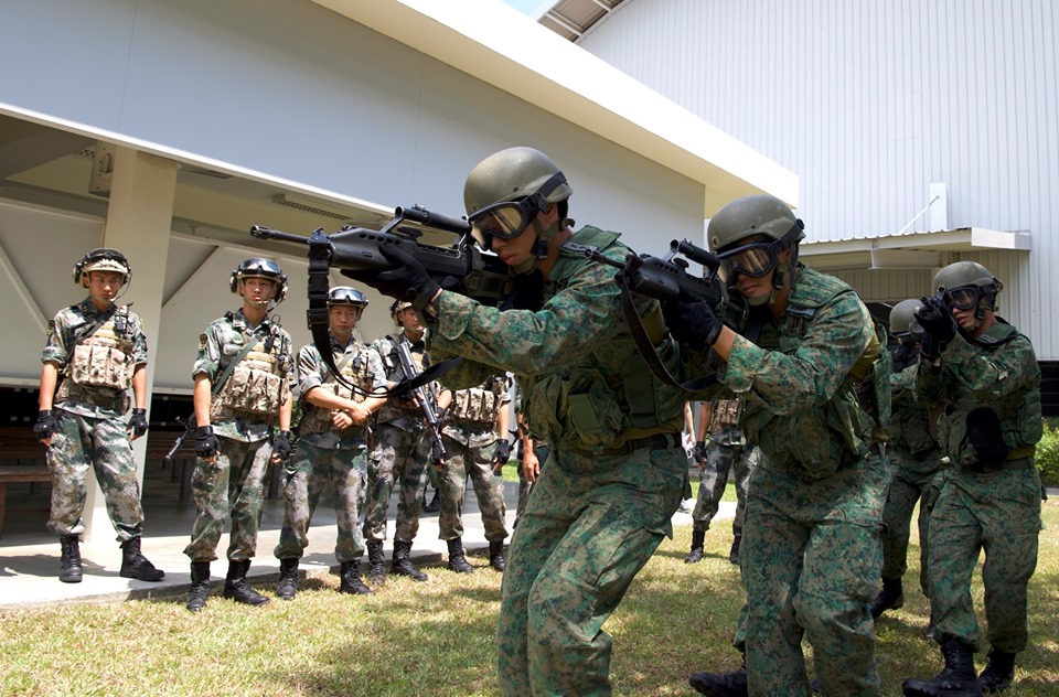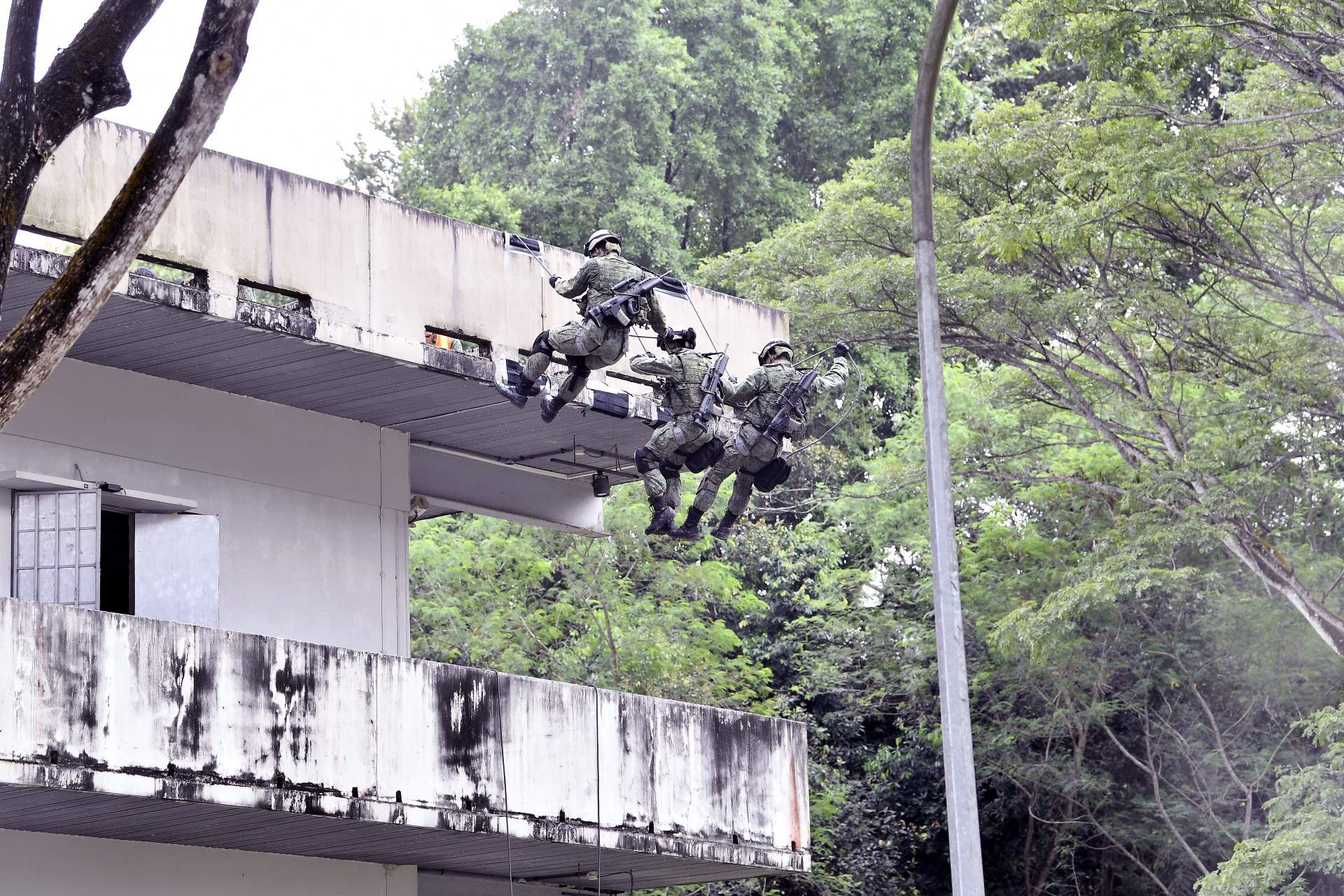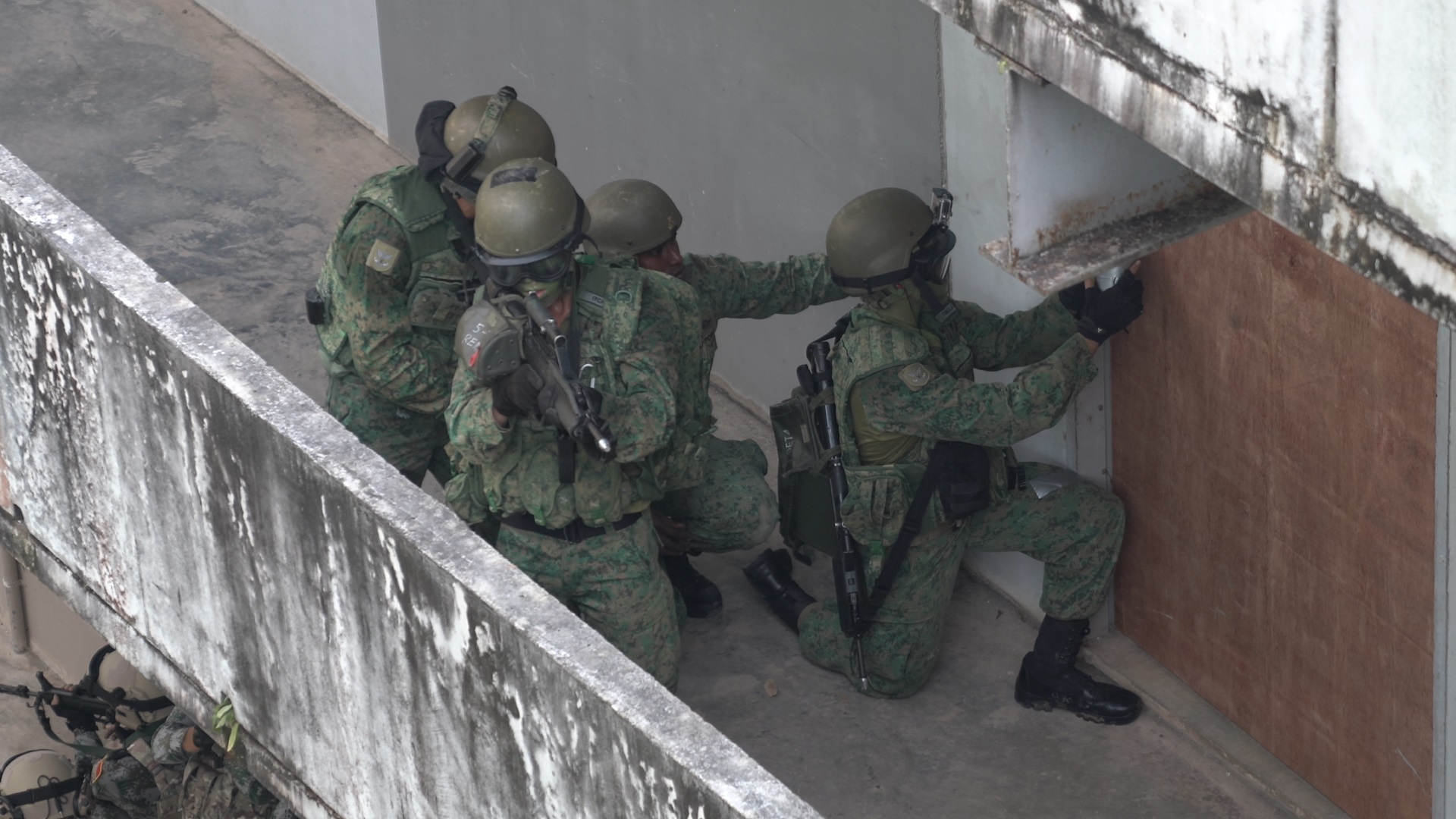 Soldiers from Singapore and China moved silently towards a three-storey building where terrorists were hiding. Two teams mounted mobile ladders and climbed up to the second floor, where they began planting explosive charges on the doors.