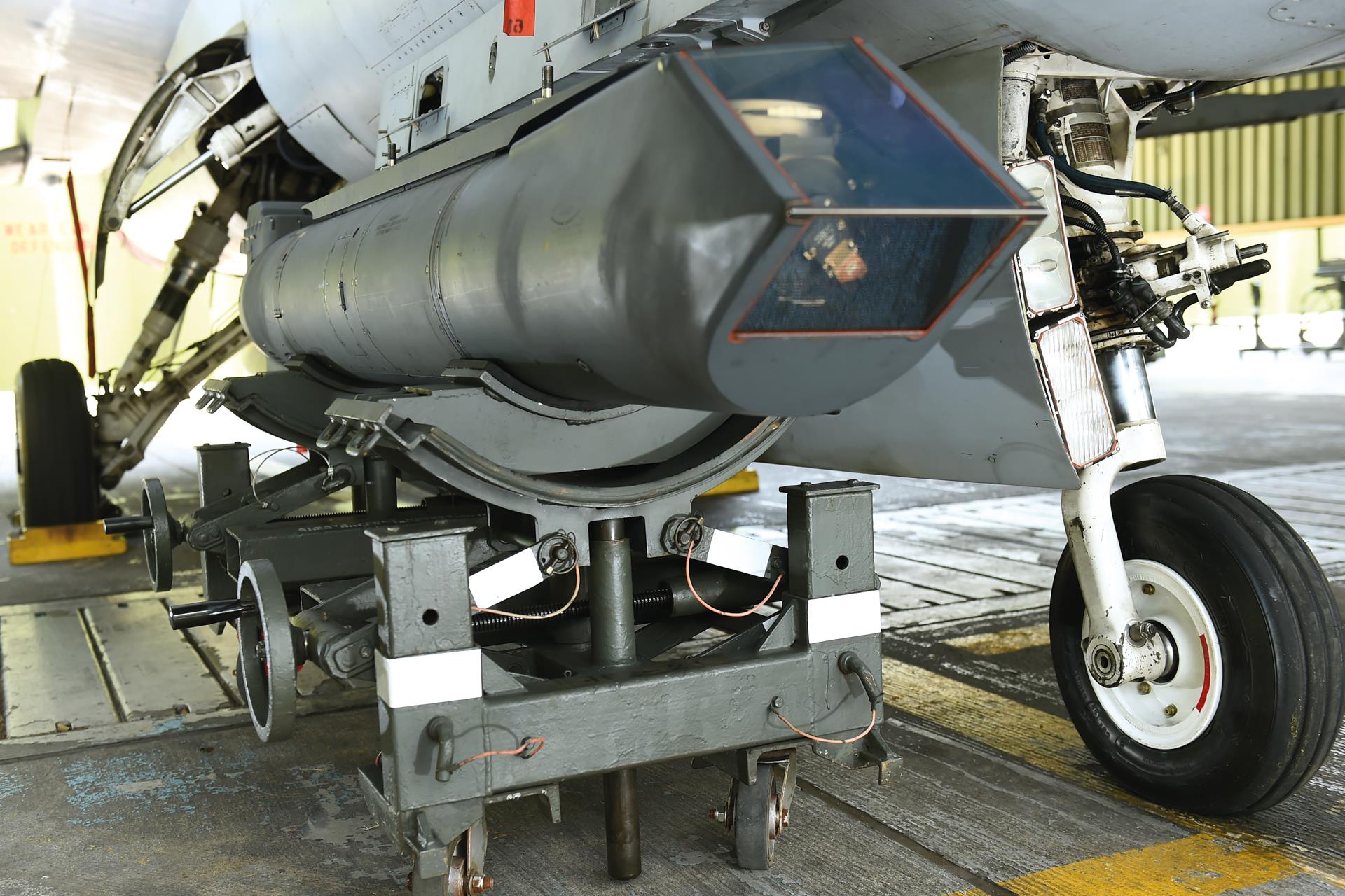 Using a trolley-like device called a loader, they move the 370-gallon (about 1,400 litres) fuel tank to the aircraft for installation. Next up is the targeting pod.