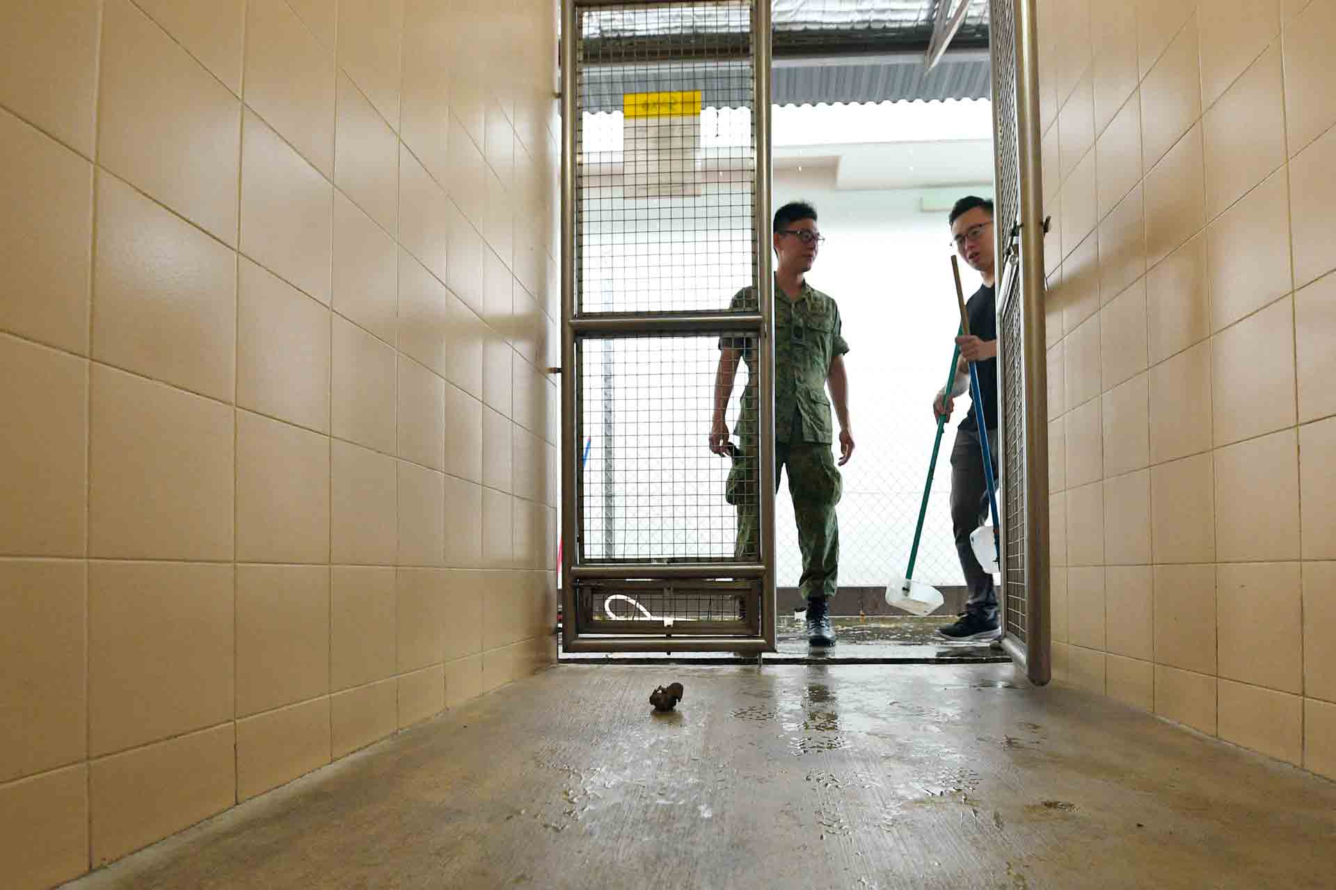 My instructor was Master Sergeant (MSG) Yeo Zong Zhe, 29, the Training 2nd-in-charge in MWDU. The first business of the day was to take care of the dog's business — clearing the poop and cleaning the kennel. A dog handler is responsible for the dog's living environment and hygiene.