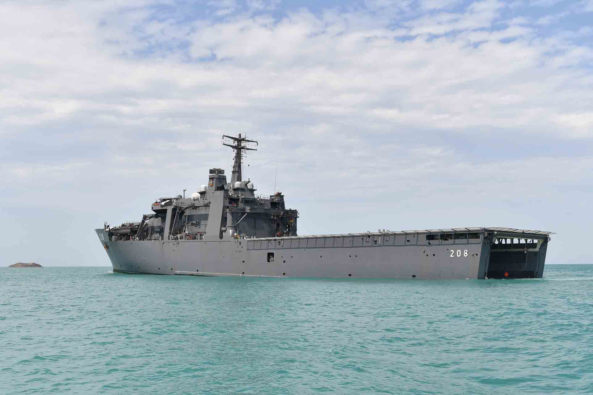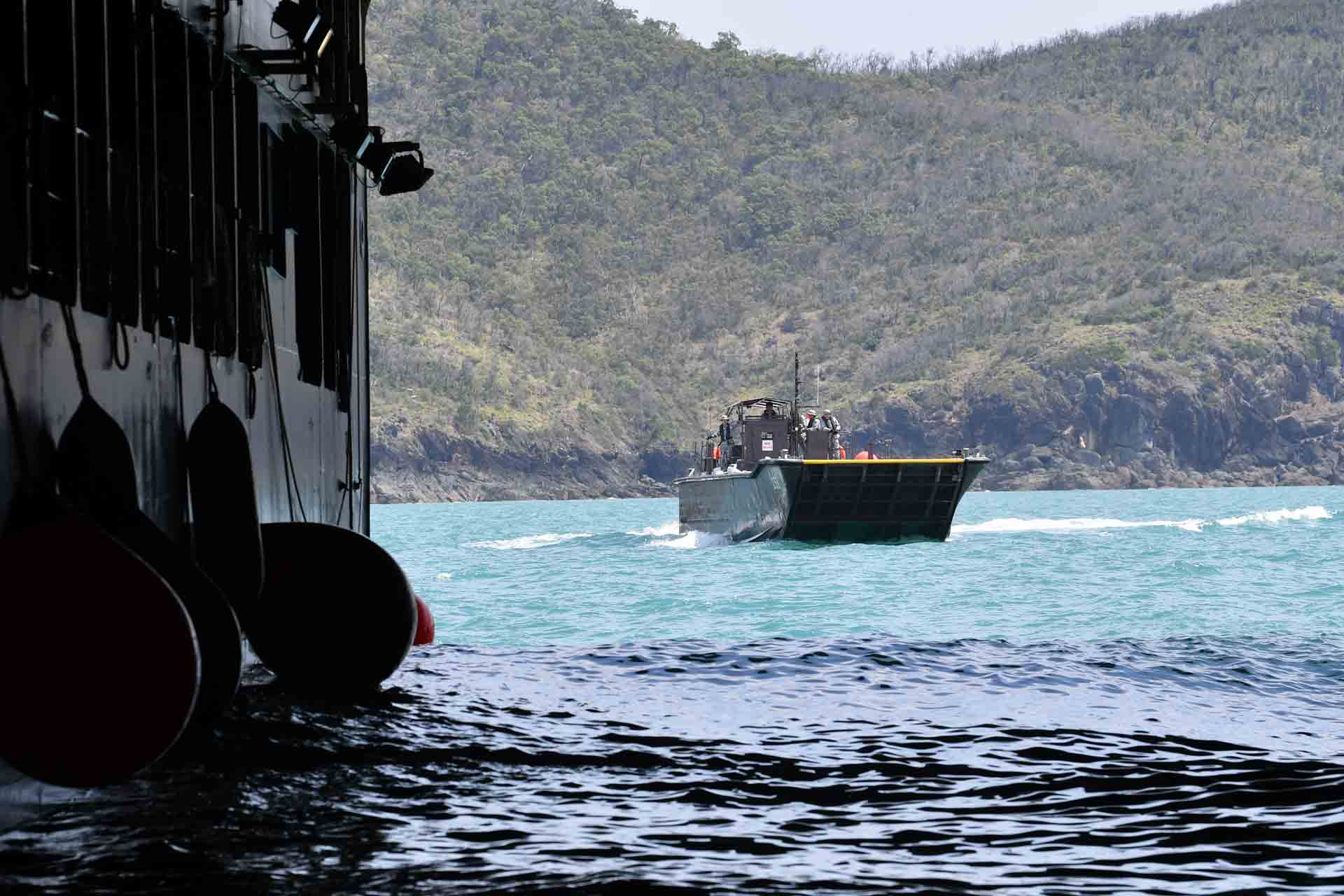 Poised and ready, Landing Ship Tank (LST) RSS Resolution is not a typical sight in the waters of Freshwater Bay at Shoalwater Bay Training Area (SWBTA) in Queensland, Australia.