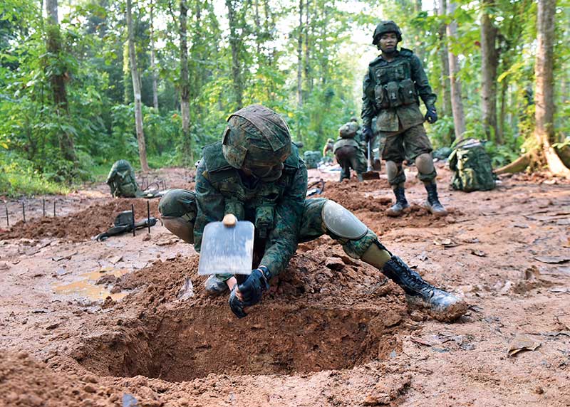 Route marches in full combat gear help to build up the recruits’ combat fitness and endurance. The longest march is 24km long, which they have to complete before their graduation parade.