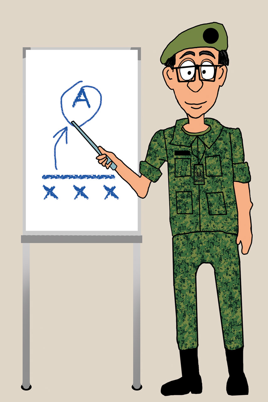 Don't worry, the Model Teacher will definitely not let you fail. Whether it's stripping and assembling your Singapore Assault Rifle 21 or tying an arm sling in buddy aid, he will walk you through the steps patiently.