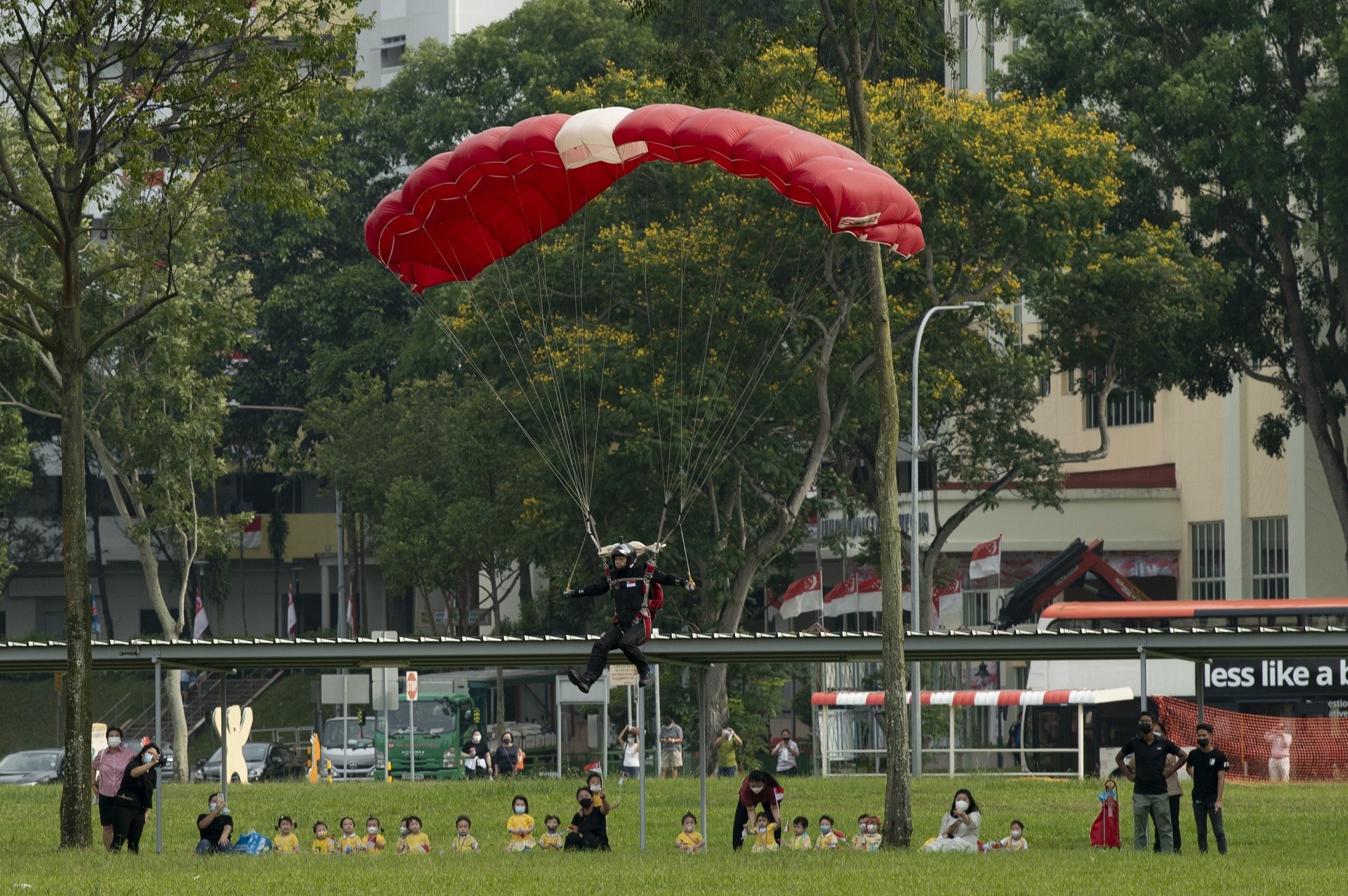 "Doing the jump in the heartlands is quite challenging way because it's a new terrain. There are buildings and traffic to look out for so our training involves a lot of practice, safety briefs and contingencies," said the 47-year-old parachutist, who is taking part as a Red Lion in NDP for the first time.