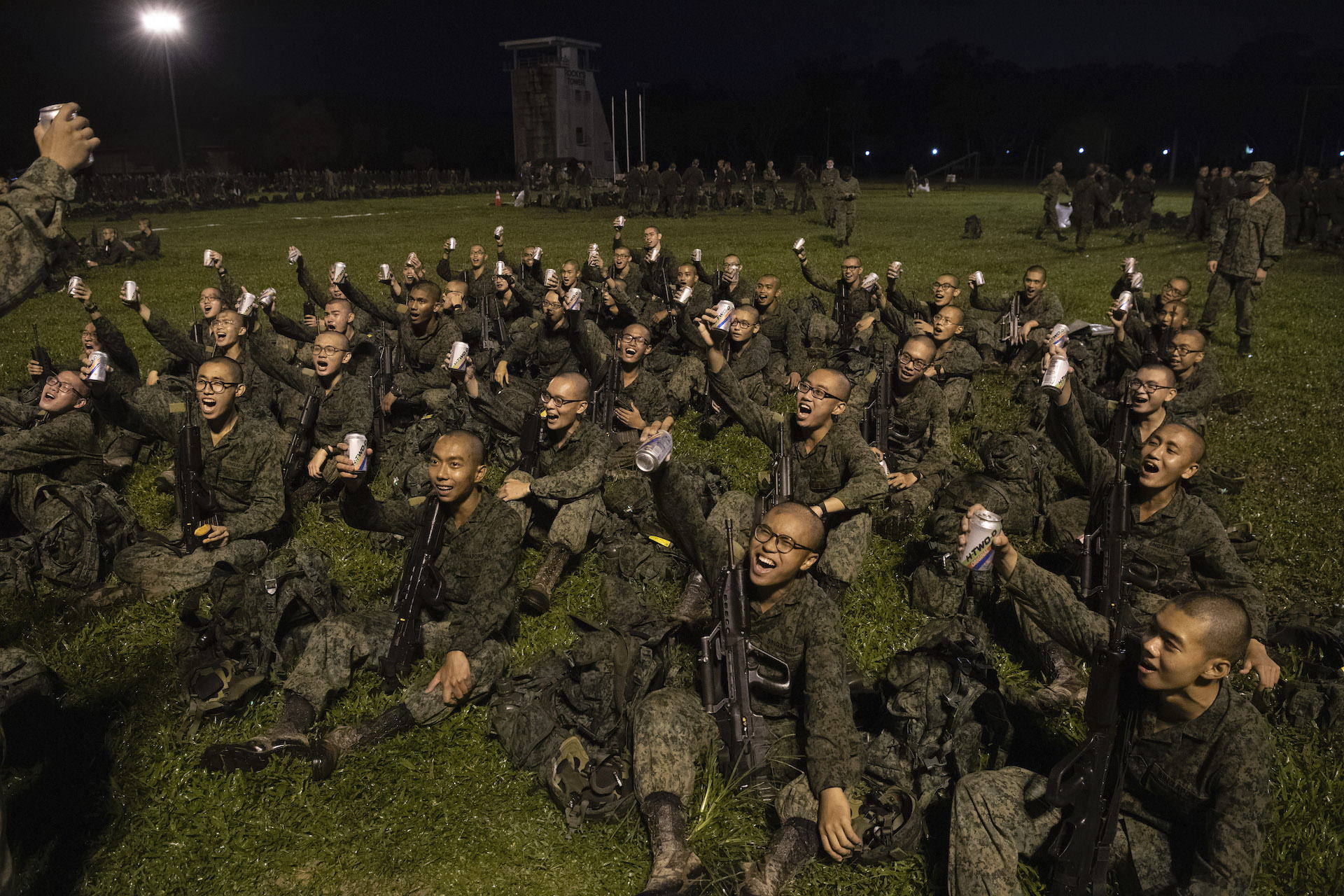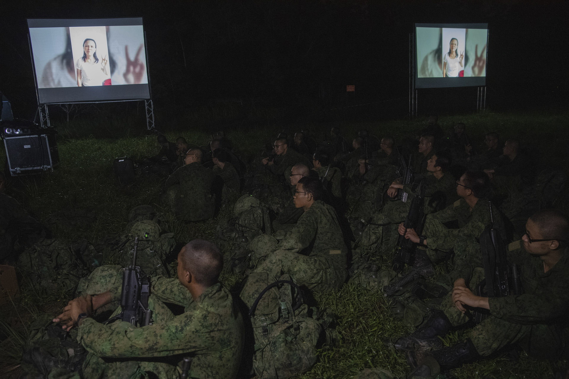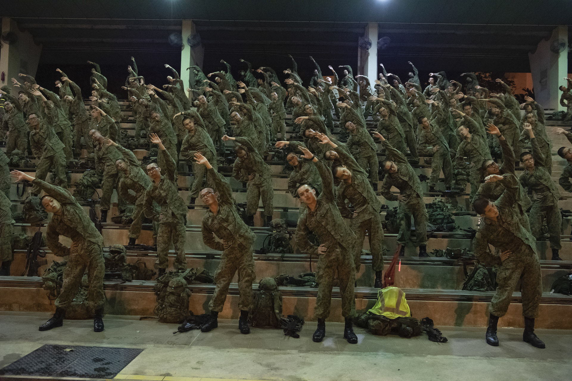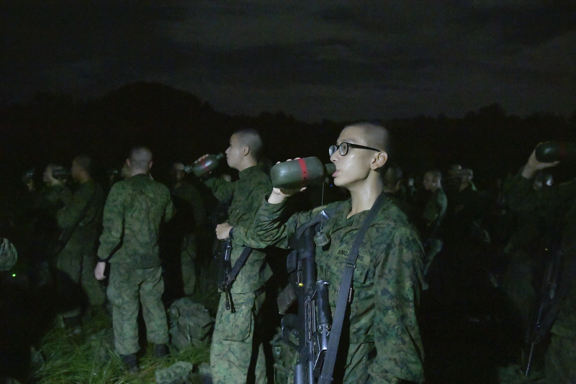 Recruits are almost halfway through their march as they reach their 8km rest point, in a dark open field deep into the north-western tip of Tekong.