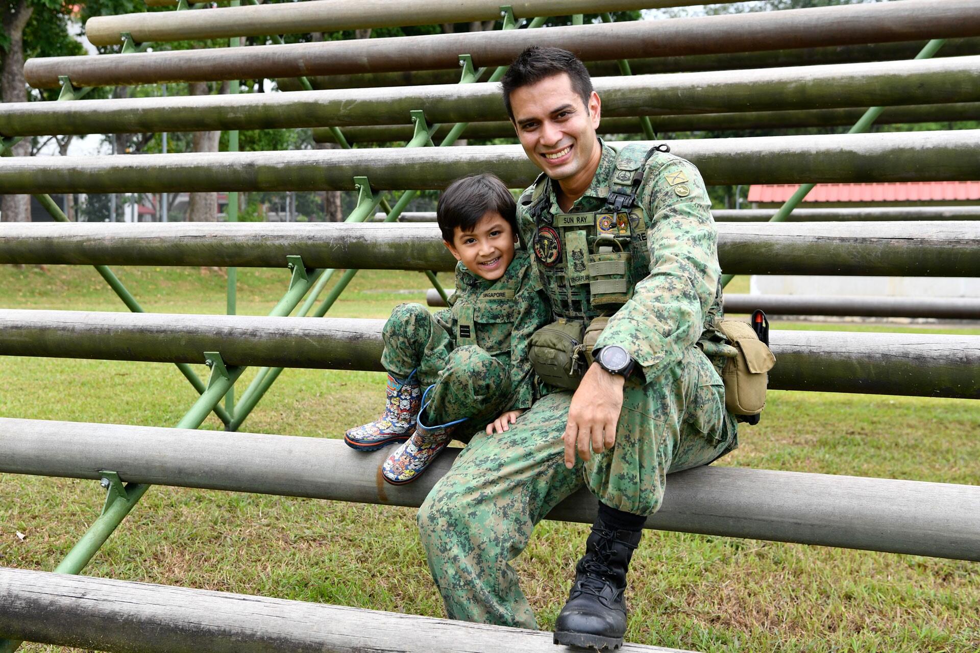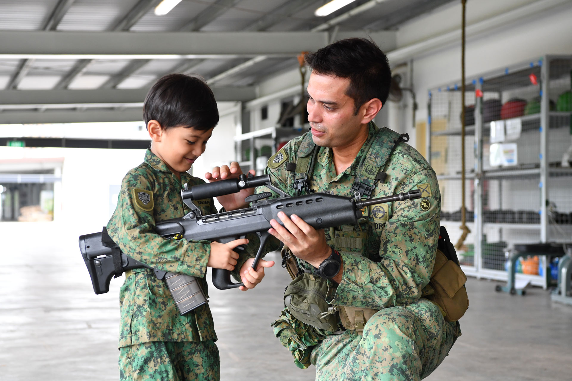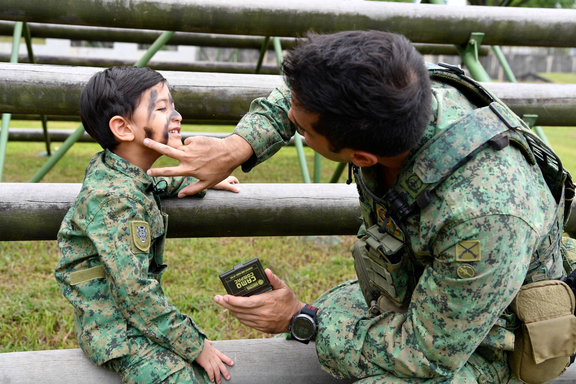 LTC Abu Bakar, Commanding Officer of 5 SIR, brought his son Adam to his unit for some hands-on with the Standard Obstacle Course, camo cream and the SAR 21 in the last of this year's PIONEER Kids series.
