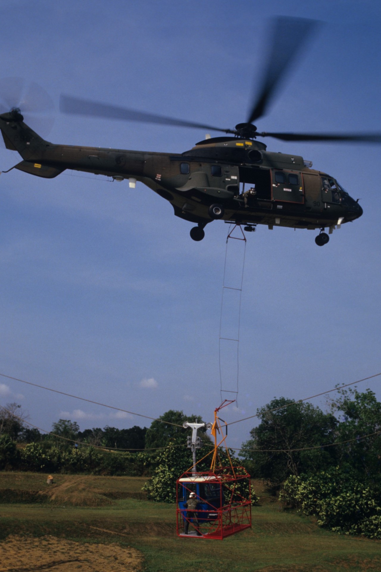 1987 年,新加坡空军部队(RSAF)开始使用专为缆车事故设计的新型救援系统进行训练。这种在瑞士开发的"缆车救生笼救援"系统包括一个重达 200 公斤2m x 2m x 4m笼子,由空心金属条构成,最多可搭载六名乘客(不包括机组人员),并且不受强风影响。